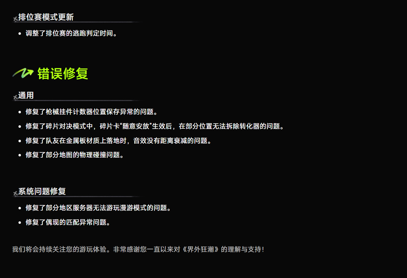 我們將會持續關注您的遊玩體驗。非常感謝您一直以來對《界外狂潮》的理解與支持!