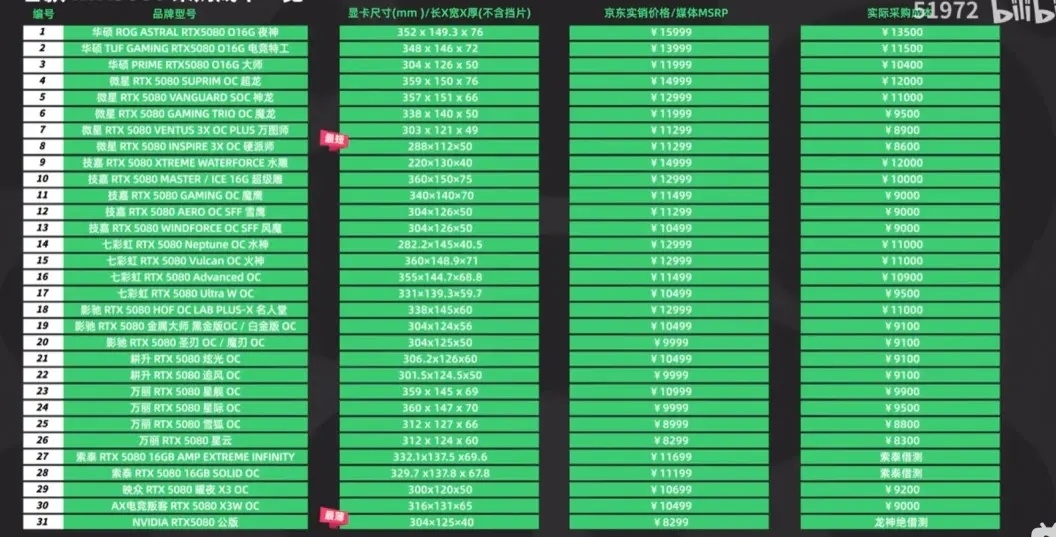 然而,實際情況是,消費者在市場上購買到的RTX 5080顯卡價格普遍遠高於建議零售價。5哥在視頻中還貼出了各品牌RTX 5080在京東的零售價,絕大多數都超過了萬元大關。這反映出當前市場上RTX 50系列顯卡的供需矛盾依然十分突出,消費者面臨着購買難、價格高的問題。