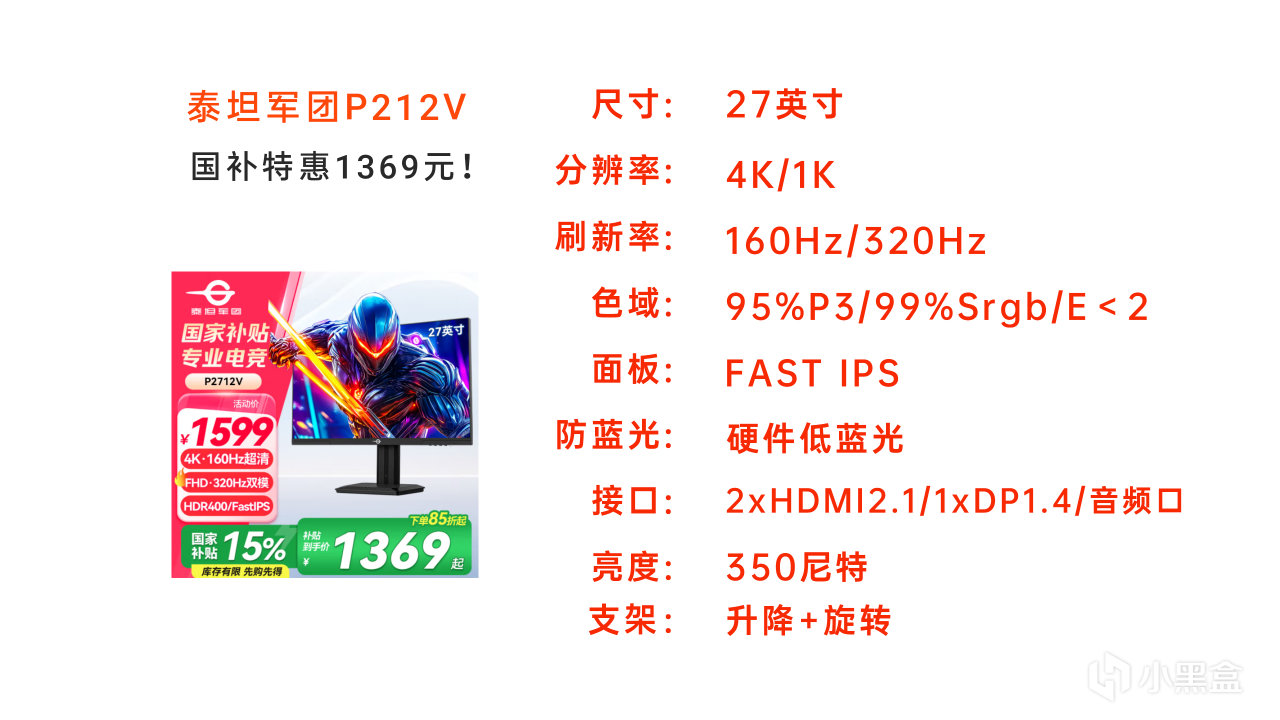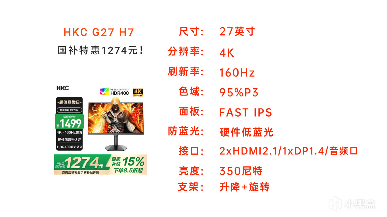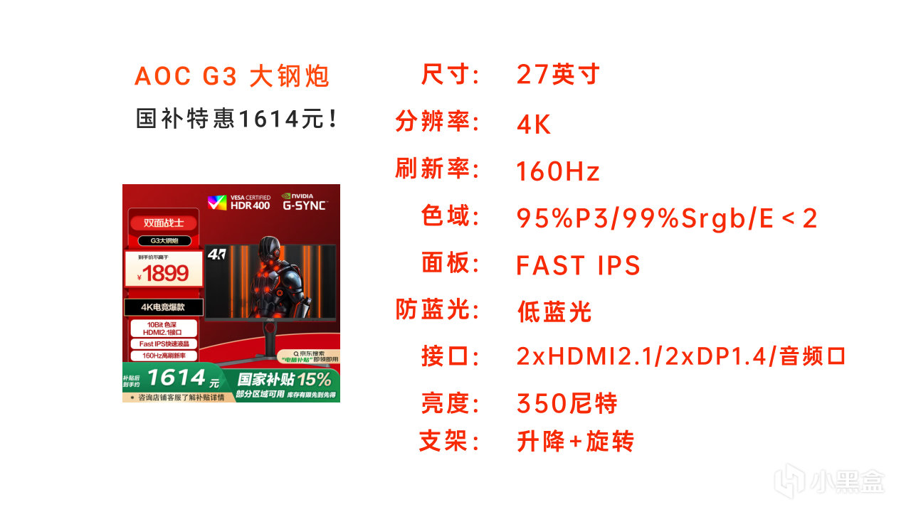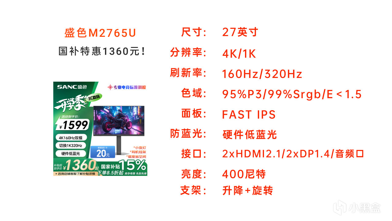 27英寸4K160hz高刷,fastips面板,1ms,400尼特亮度。支持硬件低藍光,廣色域色準<2。