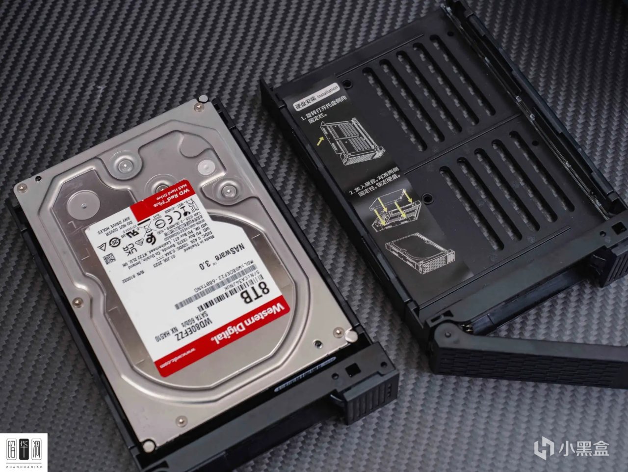 ▼硬盤的安裝採用了無螺絲的固定方式。在安裝硬盤之前,先打開兩側的固定卡扣,然後將硬盤接口朝外、正面朝上地放入內託中,對準四個固定卡扣後扣緊,最後將其插入硬盤櫃就完成了安裝。