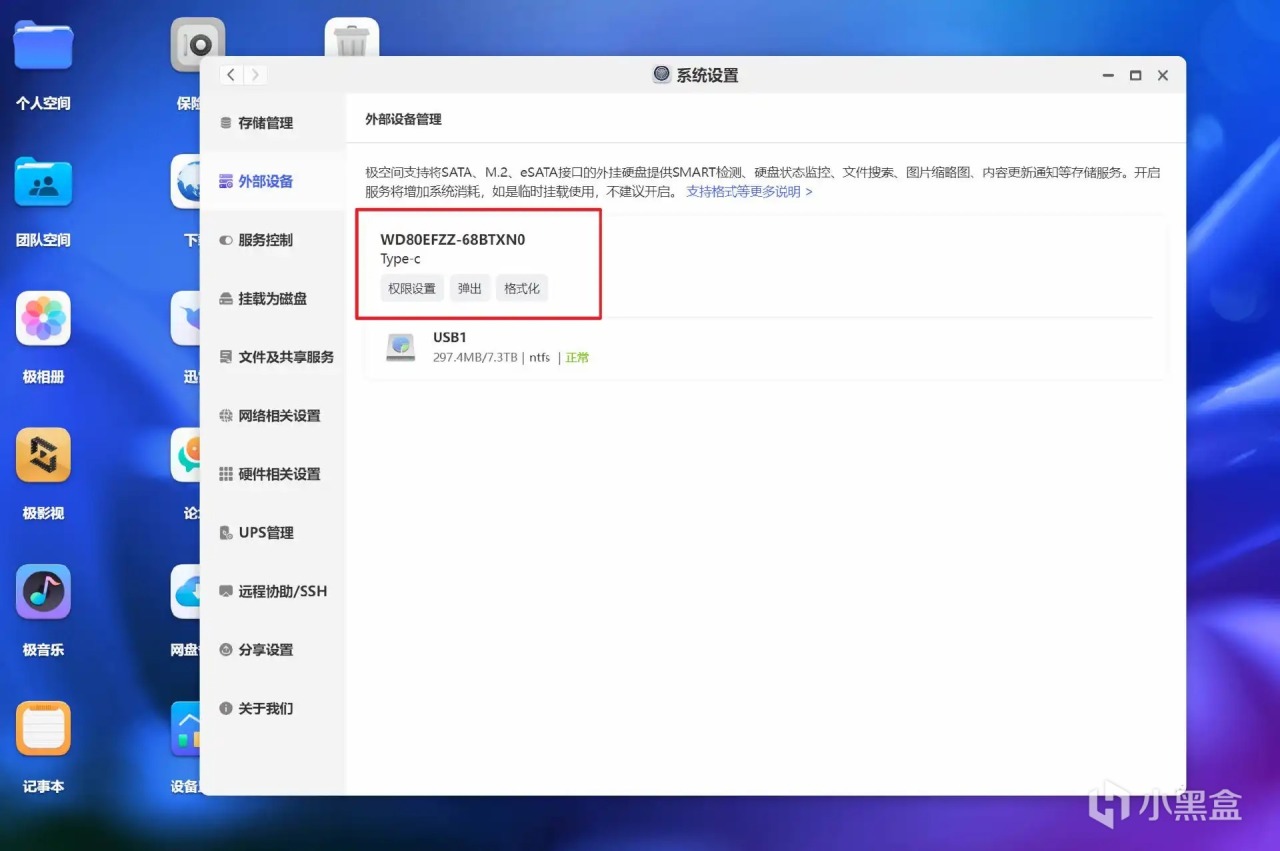 ▼首先看看與 NAS 的配合,測試設備爲極空間 Z4S、硬盤是塊 4T 的西數紅盤(沒辦法,玩 NAS 的啥都不缺就缺硬盤),兩者相連接,可以看到極空間立馬識別到了硬盤櫃
