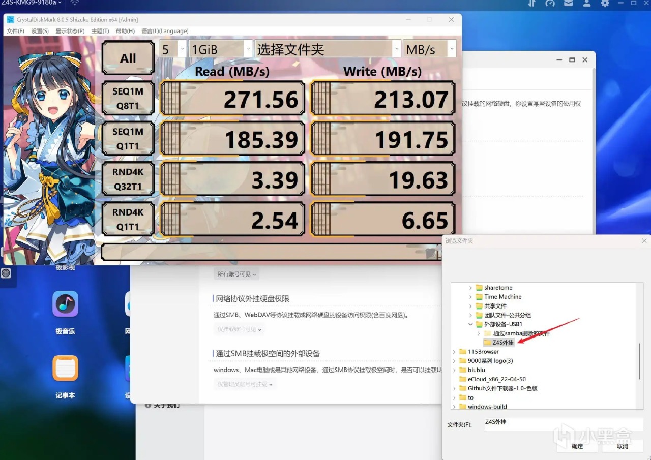 ▼測試下速度,可以看到阿卡西斯硬盤櫃雖然是作爲掛載形式存在,但速度可謂相當驚豔,讀取達到 271MB/s,寫入也在 210MB/s 以上,基本達到了硬盤的物理速度極限。