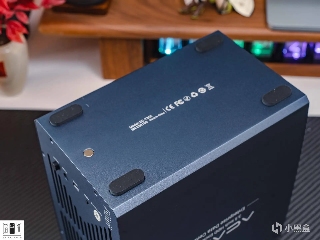 ▼這種立式硬盤櫃還是第 一 次玩,感覺比橫置式的看起來更小巧些。機身三圍 203 X 133 X 220mm,全身均做了深藍噴塗,側面印有 ACASIS 的 LOGO,頂部做了溝槽輔助散熱,整體比較簡潔,顏值在線。