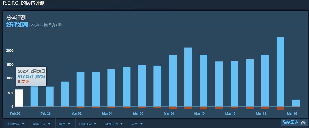 2025 年 2 月 26 日,《R.E.P.O.》发售了,发售第一天就取得了600篇好评,可以看出玩家对这款游戏的认可。截止于2025年3月16日,steam上的好评已经累计了27488条,好评率高达96%。
