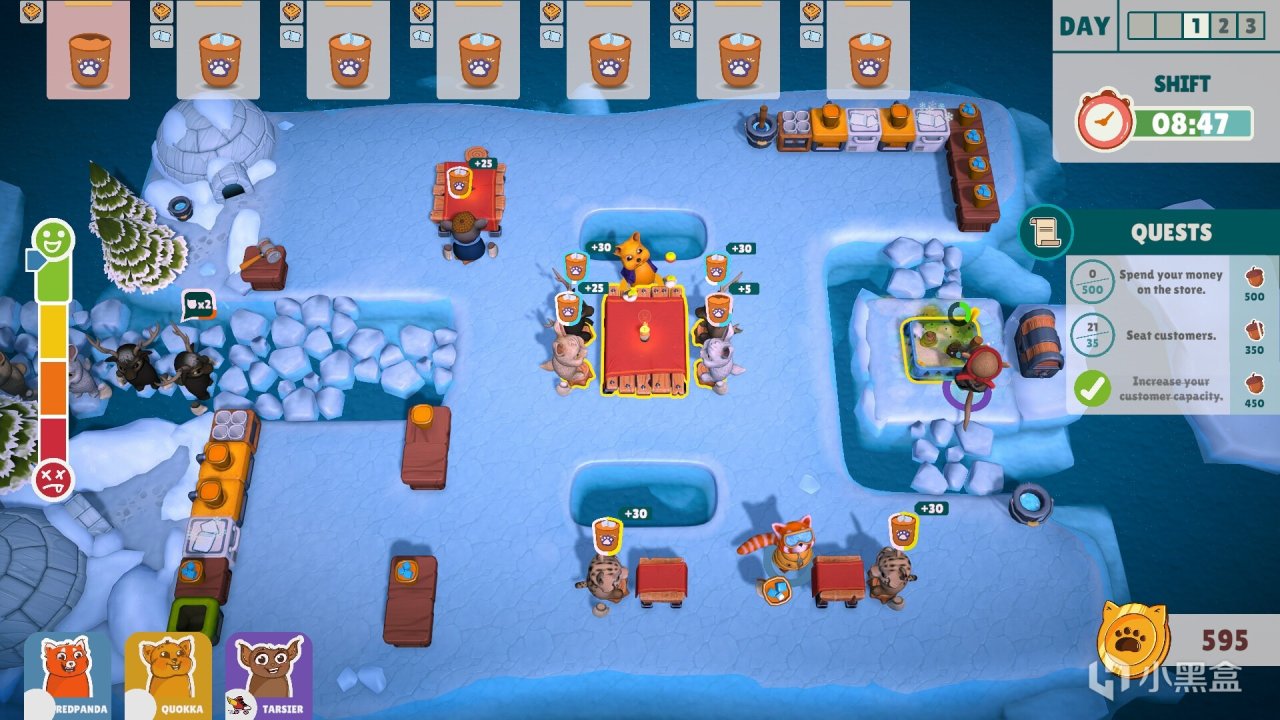 每位顾客都拥有独特的个性和座位偏好。例如,暴躁的老虎一生气就会掀翻桌子、憨厚的野牛讨厌上餐太慢、调皮的臭鼬可能会突然“释放气体”让周围的人晕倒!小心,千万别把大灰狼的座位安排在兔子旁边,这可能会让局面变的棘手!当然,你也可以在事情失控前采用一些“物理手段”(比如拿起木板,将闹事的顾客赶出去!),要知道,平衡好顾客之间的关系,才能将餐吧更好的经营下去。