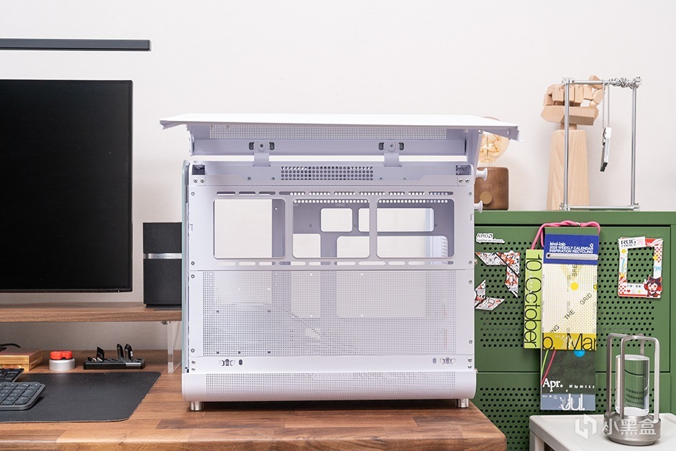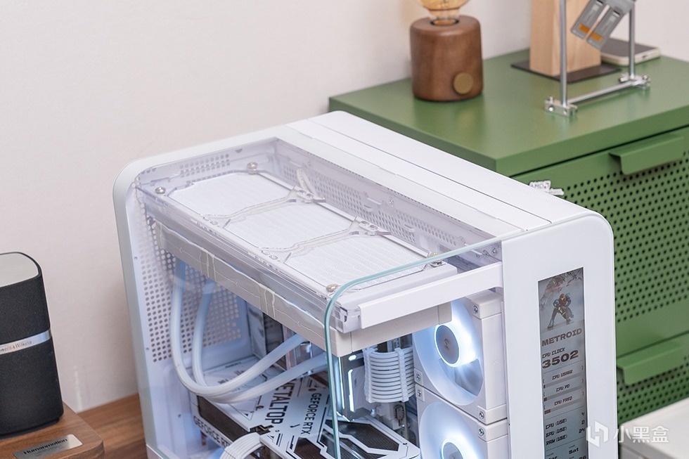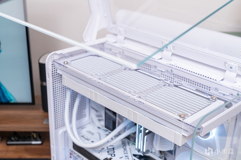 散熱方面,機箱提供了多達12個120規格散熱風扇安裝位、頂部更配備了一塊透明亞克力材質的懸浮風扇支架,安裝360規格水冷散熱系統。同時也支持安裝高度不超過168mm的風冷散熱器。