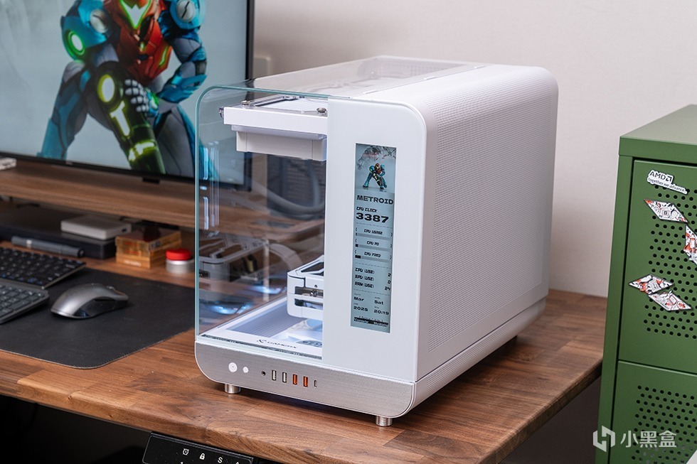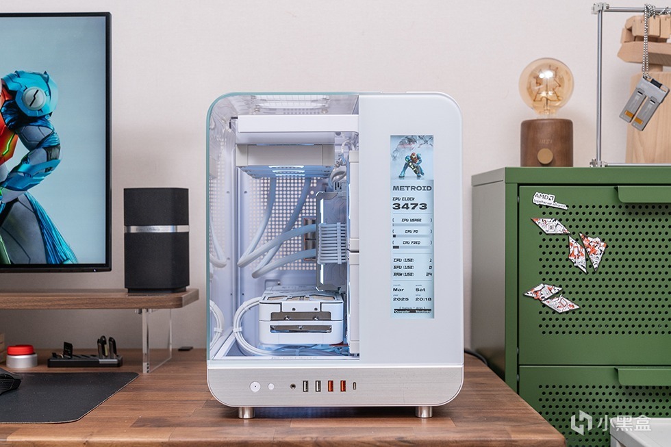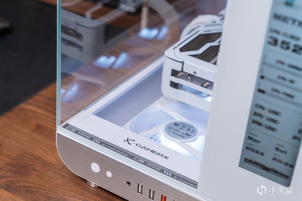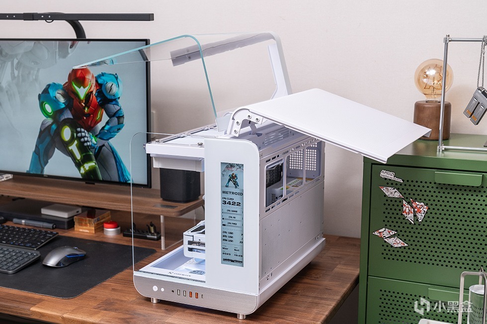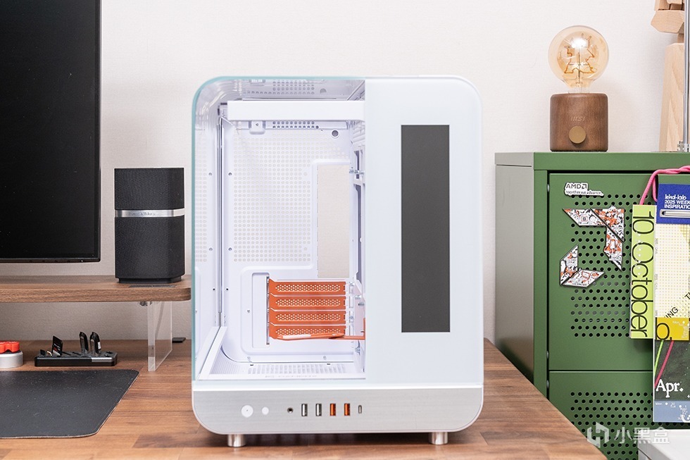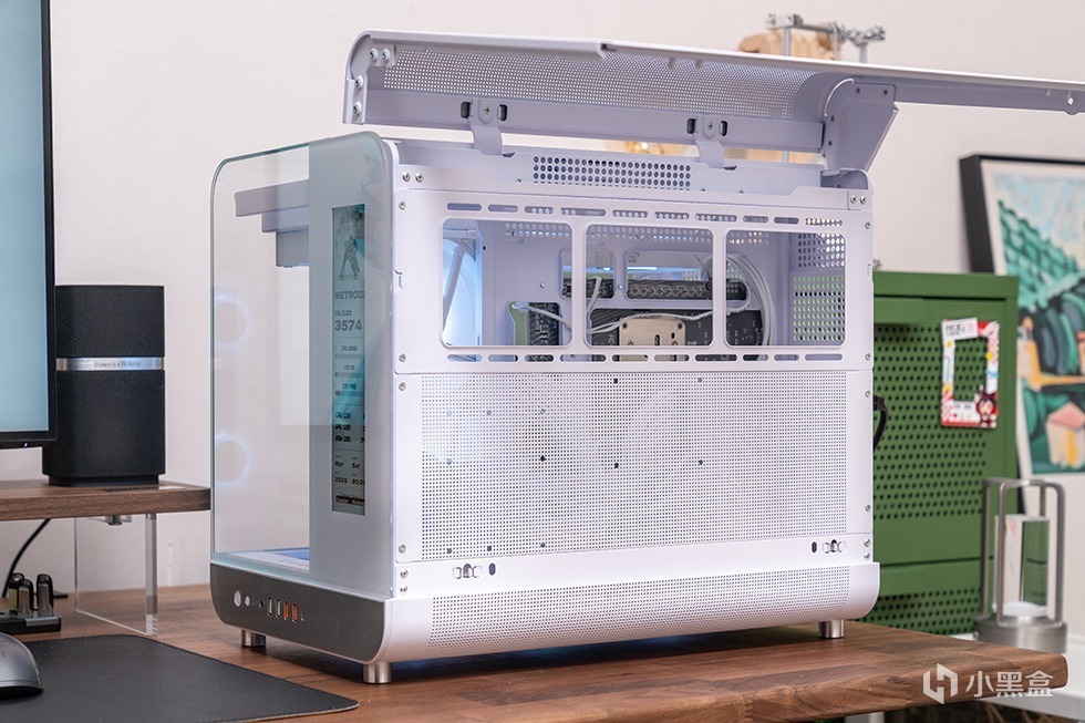 機箱採用左右分倉的機構佈局,左側與頂部覆蓋着一整塊熱彎工藝處理的曲面鋼化玻璃面板,右側則以金屬網孔面板點綴,頂部區域巧妙地設計了曲面過渡,與玻璃面板完美融合。前面板融合了玻璃與鋁合金的精緻拼接,玻璃面板支持便捷拆裝,右側預留的開窗位置鑲嵌着一塊8.8英寸的LCD顯示屏。機箱I/O面板巧妙地融入鋁合金面板之中,配備了2個USB 3.0接口、2個USB 2.0接口、1個Type-C數據接口、1個3.5mm音頻輸入輸出二合一接口,以及一組配備提示燈的開機和重啓按鈕。