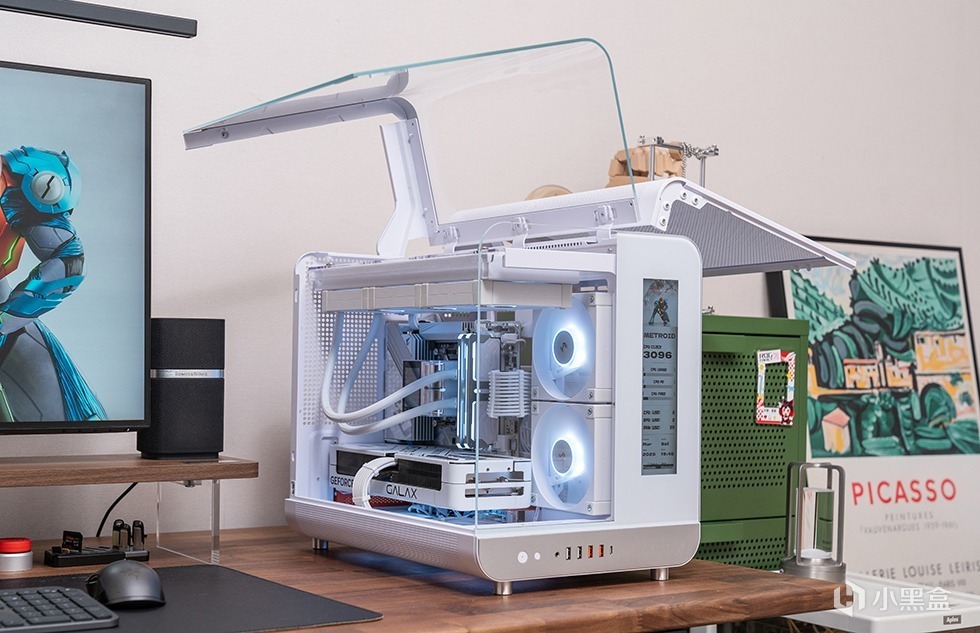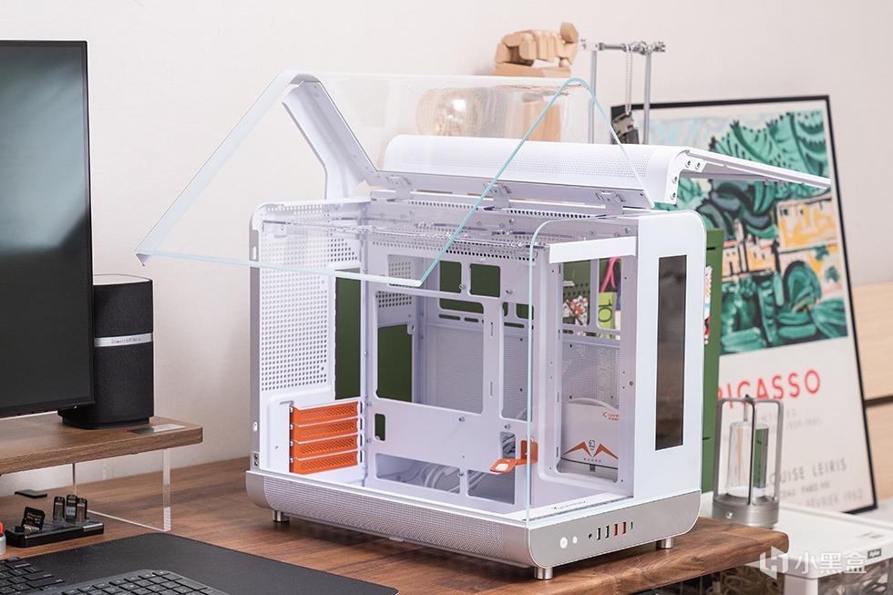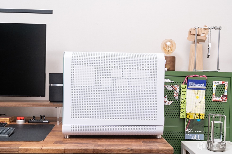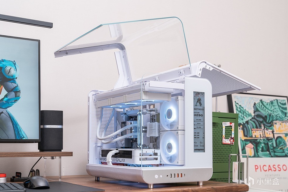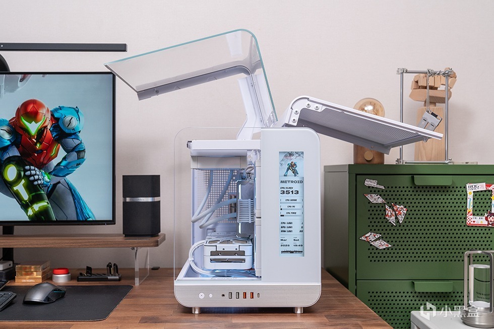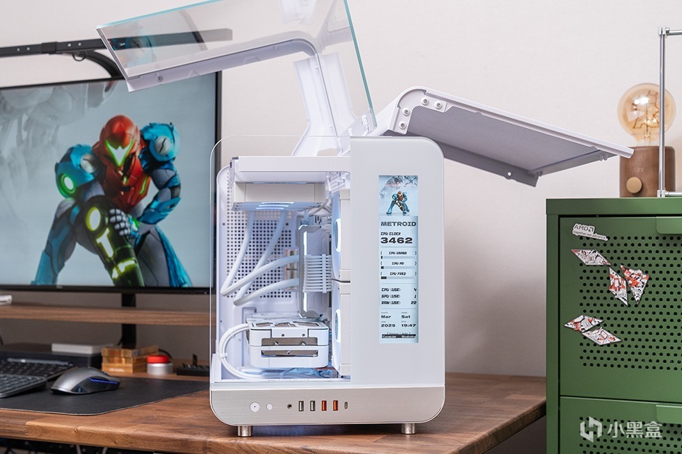 機箱採用左右分倉的機構佈局,左側與頂部覆蓋着一整塊熱彎工藝處理的曲面鋼化玻璃面板,右側則以金屬網孔面板點綴,頂部區域巧妙地設計了曲面過渡,與玻璃面板完美融合。前面板融合了玻璃與鋁合金的精緻拼接,玻璃面板支持便捷拆裝,右側預留的開窗位置鑲嵌着一塊8.8英寸的LCD顯示屏。機箱I/O面板巧妙地融入鋁合金面板之中,配備了2個USB 3.0接口、2個USB 2.0接口、1個Type-C數據接口、1個3.5mm音頻輸入輸出二合一接口,以及一組配備提示燈的開機和重啓按鈕。