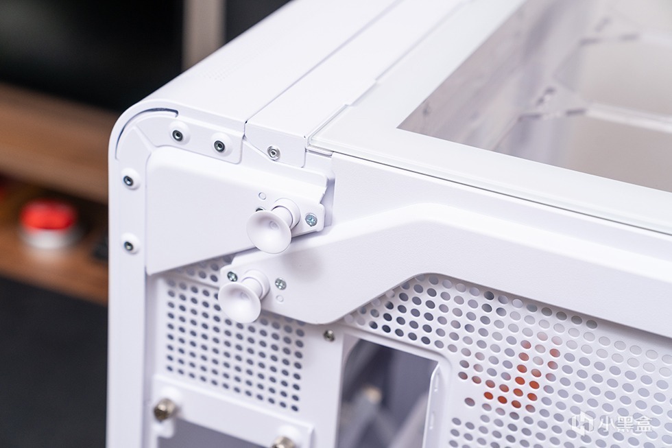 機箱兩側面板通過卡槽與螺絲的穩固結合,與機箱合頁緊密相連。輕鬆卸下玻璃側面的3顆螺絲和電源倉側的2顆固定螺絲,即可便捷拆卸機箱兩側面板。在兼容性方面,機箱內部空間充裕,完美支持MATX規格主板,同時兼容背插式MATX主板。在不安裝前面板風扇的情況下,可支持長達385mm的長顯卡。