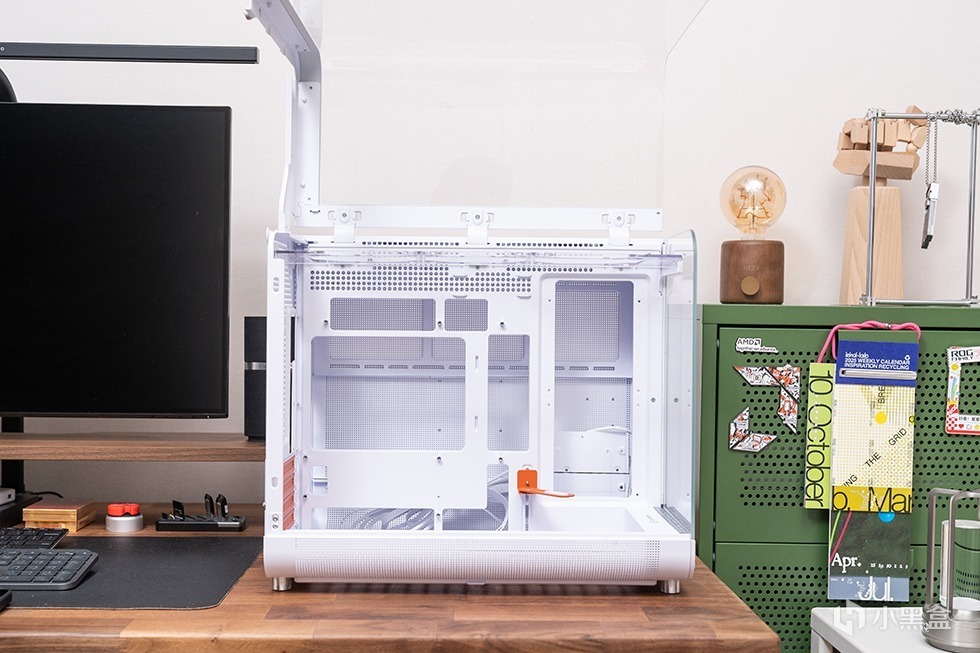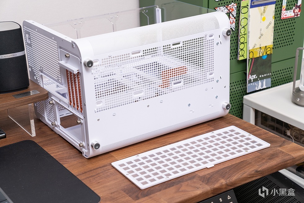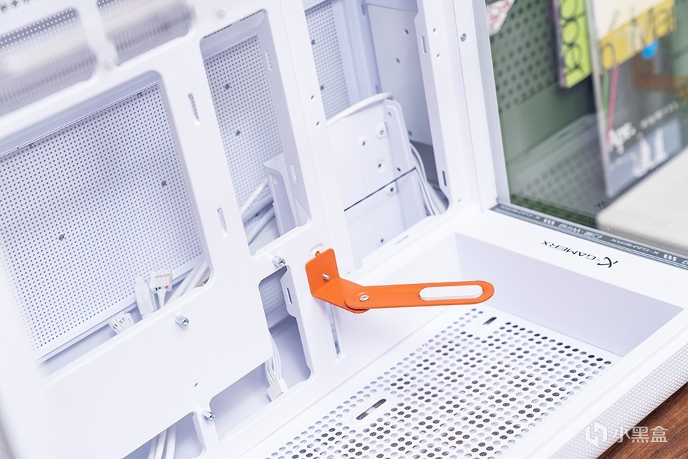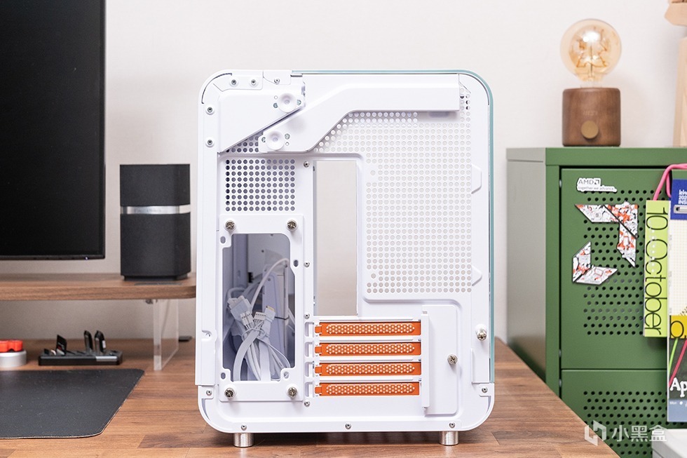 機箱尾部進行了大面積的鏤空設計,上部設有特殊卡扣結構,便於調節並固定兩側面板展開後的高度。右側預留了120mm風扇的安裝位。左下方爲電源裝安裝支架,支持拆卸。右下方則採用了醒目的橙紅色4槽PCIe擋板。