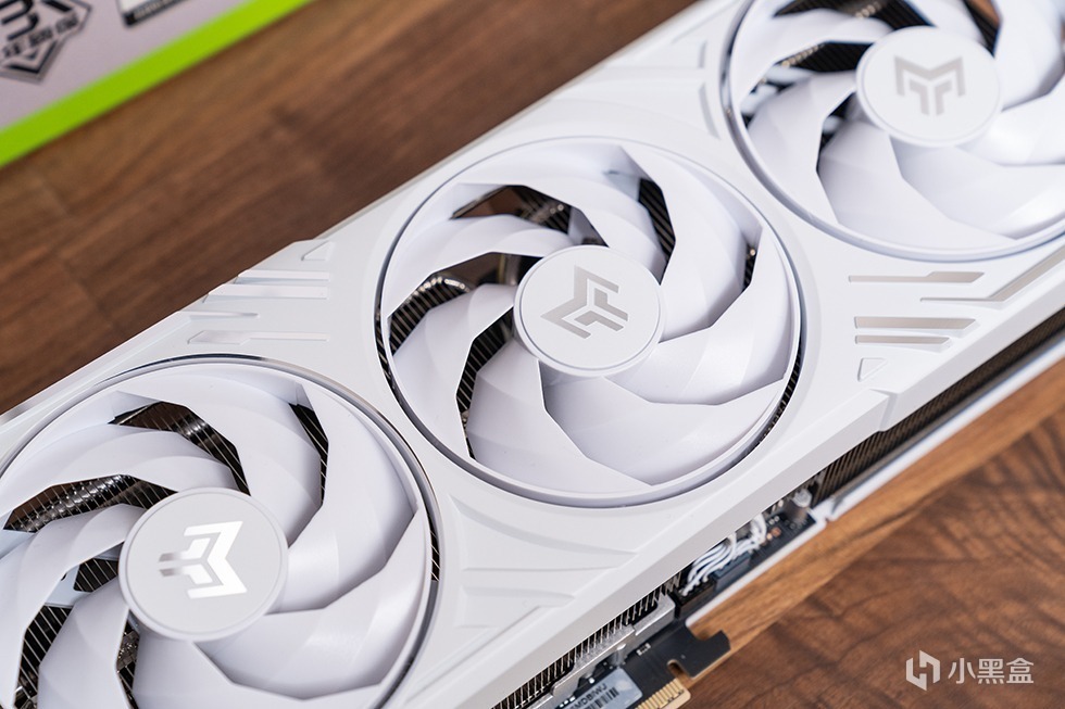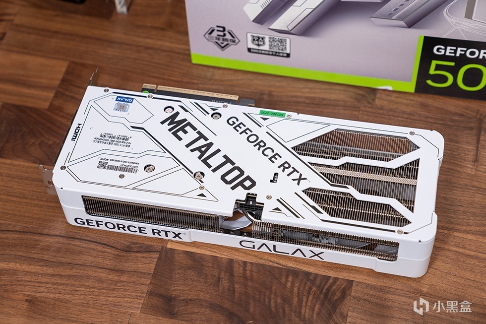 影馳 GeForce RTX 5080 金屬大師 白金版 OC側面的全金屬裝甲延伸至背板,形成360°包裹防護。背板採用陽極氧化工藝,黑色“METALTOP”系列標識採用撞色塗裝,周圍環繞機甲風格浮雕紋路,充分強化視覺張力。右側大面積的鏤空,尾端半開放設計,大風流直接穿透尾段的散熱鰭片,有效提升散熱效果。