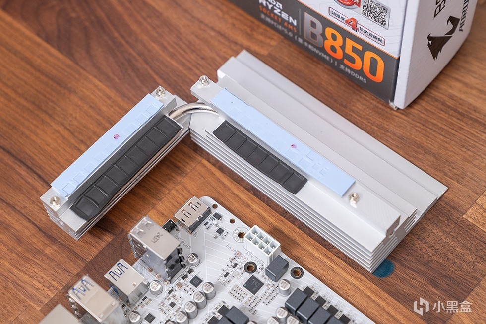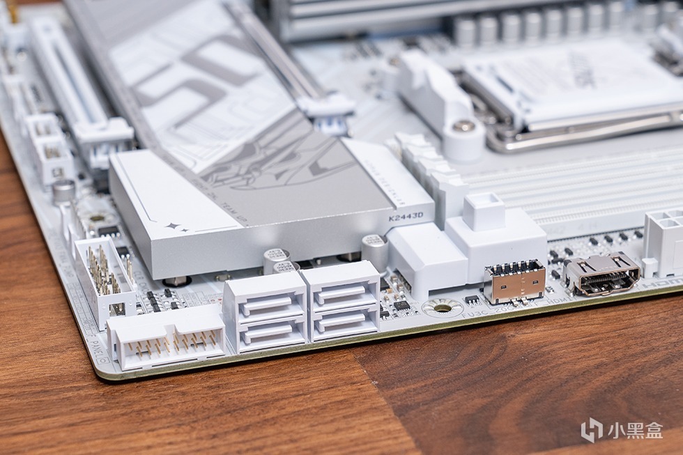 在存儲方面,主板提供了2個M.2的SSD插槽,均支持無螺絲快速安裝。其中,其中M.2_1基於CPU直連的PCIe 5.0×4通道,下方爲PCIe 4.0 x4插槽,兩個SSD共用一塊散熱裝甲。此外,主板右下端還有4個SATA接口,可進一步拓展存儲空間。