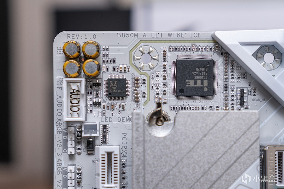 技嘉冰雕B850M AORUS ELITE WIFI6E ICE主板左下角設計了音頻線路獨立區域,配備多顆專用濾波電容,採用Realtek ALC897 Codec,提供7.1 通道高性能音頻以及S/PDIF輸出。