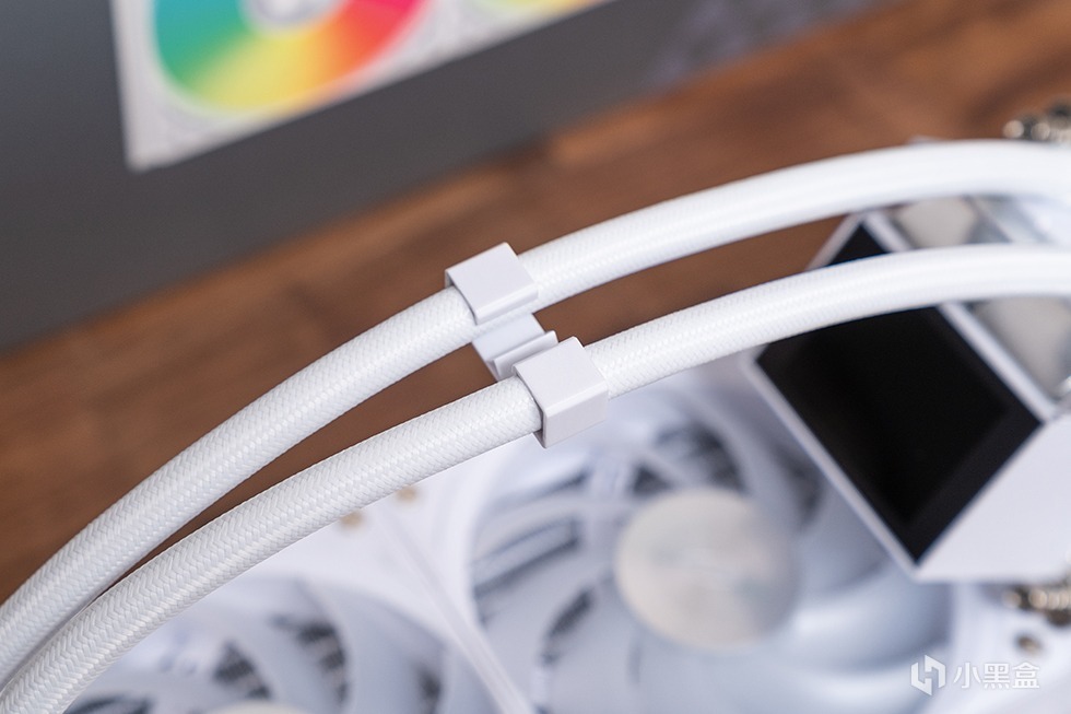 冷散熱器的外殼採用了白色爲主色調。尺寸爲396x120x27mm(LxWxH),冷排芯進行了加厚處理,高耐壓的水冷管最大限度保證了密封性,並出廠預置了2個線管理線夾。