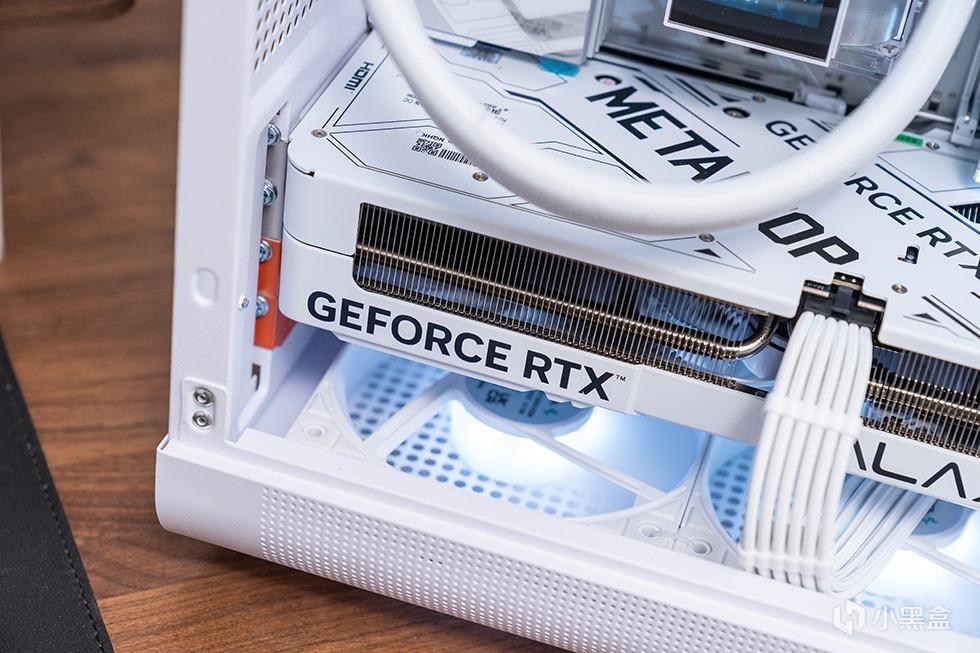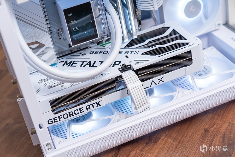 影馳 GeForce RTX 5080 金屬大師 白金版 OC顯卡在散熱方面採用新一代金屬大師寒光星β散熱系統,從顯卡尾端可以清晰看到熱管,內部共有五條8mm熱管和兩條6mm鍍鎳複合熱管,通過迴流焊接工藝和合金壓鑄中框加強件,帶來超規格散熱器組件無懼高溫。