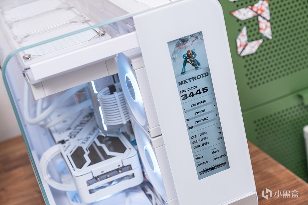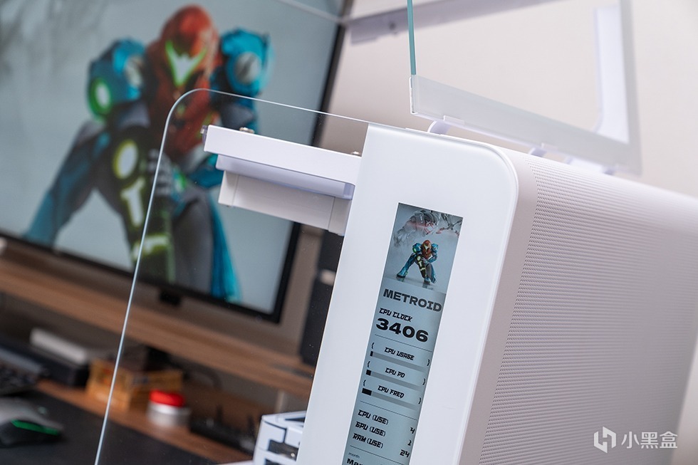 LCD屏幕擁有1920*480的高分辨率,通過USB 2.0接口與主板相連,配合專屬控制軟件,能夠實時展現主機內部硬件狀態。軟件內置20餘款個性化主題,玩家可根據個人喜好自由切換。屏幕內置66MB存儲空間,並預留TF卡插槽,方便玩家上傳自定義圖片或視頻,將機箱屏幕打造成個性化的數碼相冊或播放設備(插入TF卡後,無需連接主板即可獨立通電使用)。