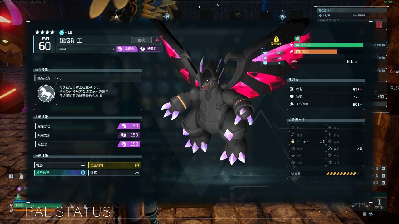 雖然上篇文章我推薦的採礦帕魯是兼具四級採礦和四級搬運的泰鋒,但是因爲我據點使用了多隻阿努比斯和伊西斯兼職搬運,所以我據點用的採礦帕魯是暗系的魔淵龍(多一個工作詞條挺香的),使用魔淵龍配種也有暗系配種一條龍,暗系帕魯會放在最後一起說。