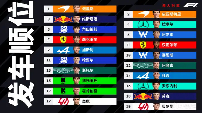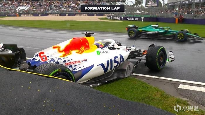 首先第一圈是暖胎圈,所有賽車會慢速繞賽道一圈,讓輪胎和剎車升溫,確保起步時的抓地力和安全性,我平時看摩托GP或者卡丁車這些賽事一般都有暖胎圈。這一圈車手都會用“蛇形S走位”加熱輪胎,這一招也會在安全車出動時看到。我感覺暖胎圈不是看點,但是今年澳大利亞站給大夥整了個大活,小紅牛車手新秀車手哈賈爾在暖胎圈撞牆退賽,對車手信心打擊還蠻大的。