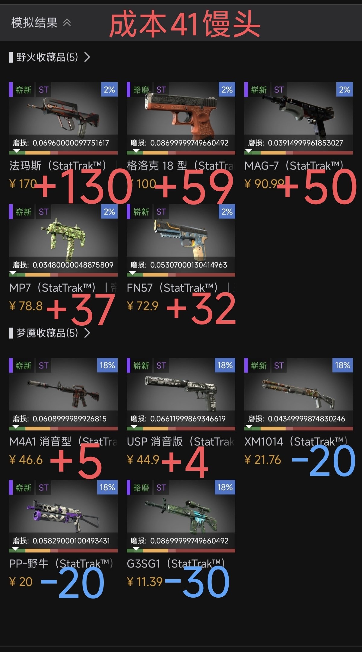 就算炸爐出夢魘也不要慌,M4以及usp我們也保本小賺一瓶飲料,其餘三個則虧20-30饅頭,作爲暗金爐這個起飛對應的虧損還是比較合理的,而且出貨材料全部都是鍊金好材料,好賣也可以自己往上打