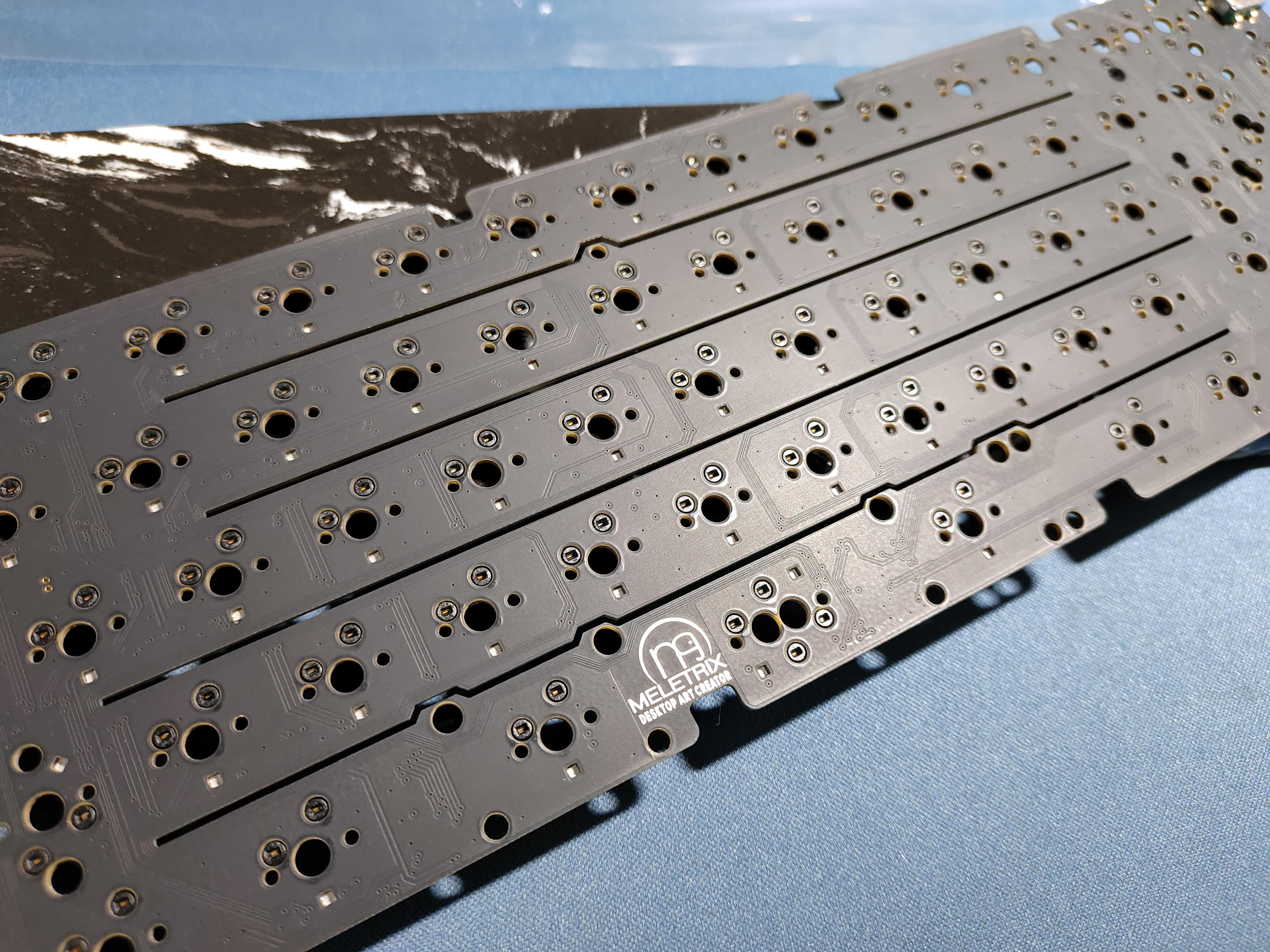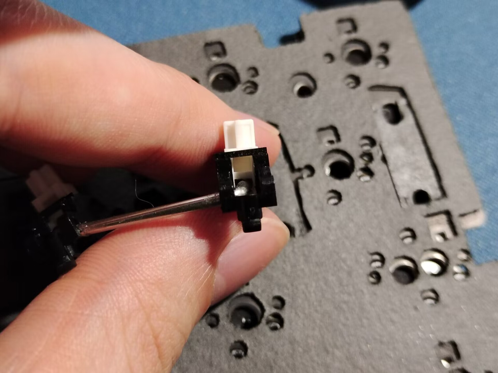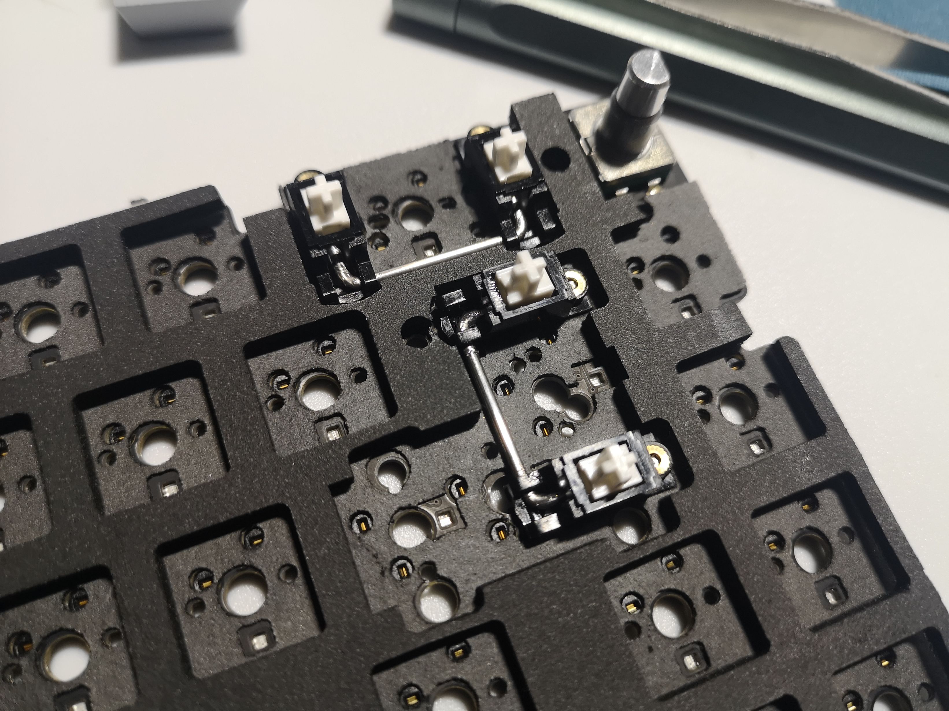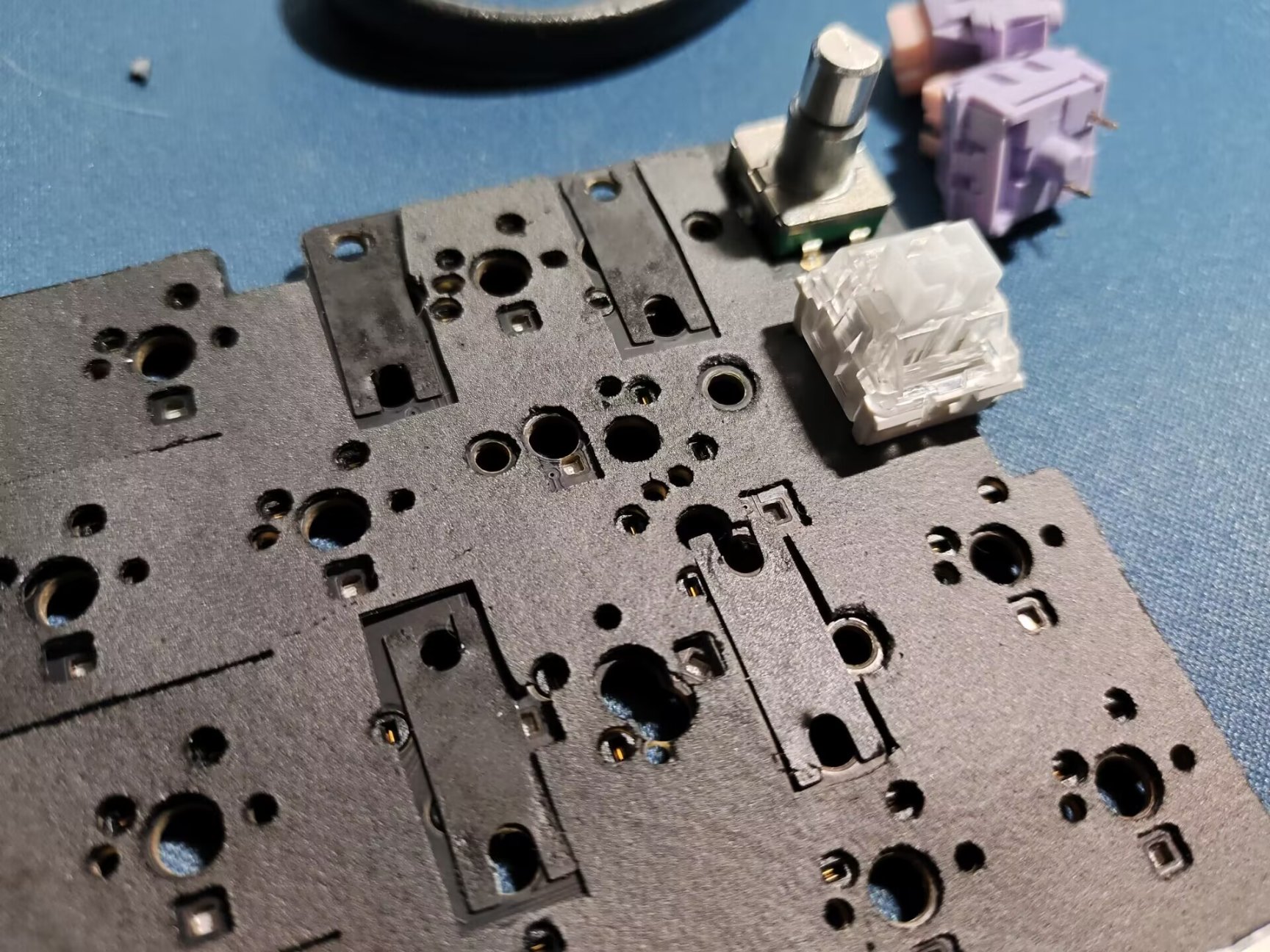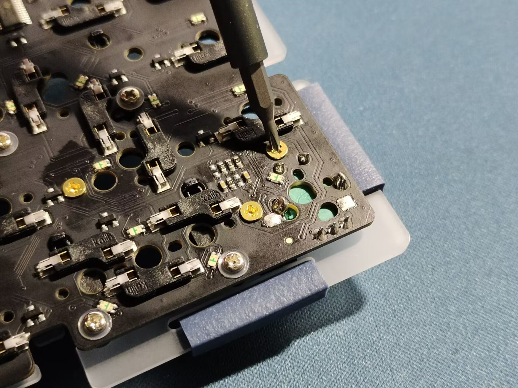 将刚才装好卫星轴的pcb上铺上夹心棉和定位版,位置如果对不齐可以在几个角上上一下轴体固定。