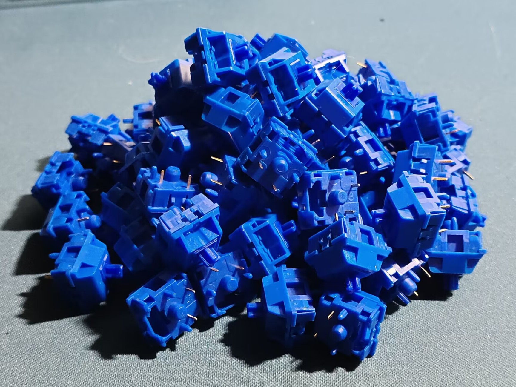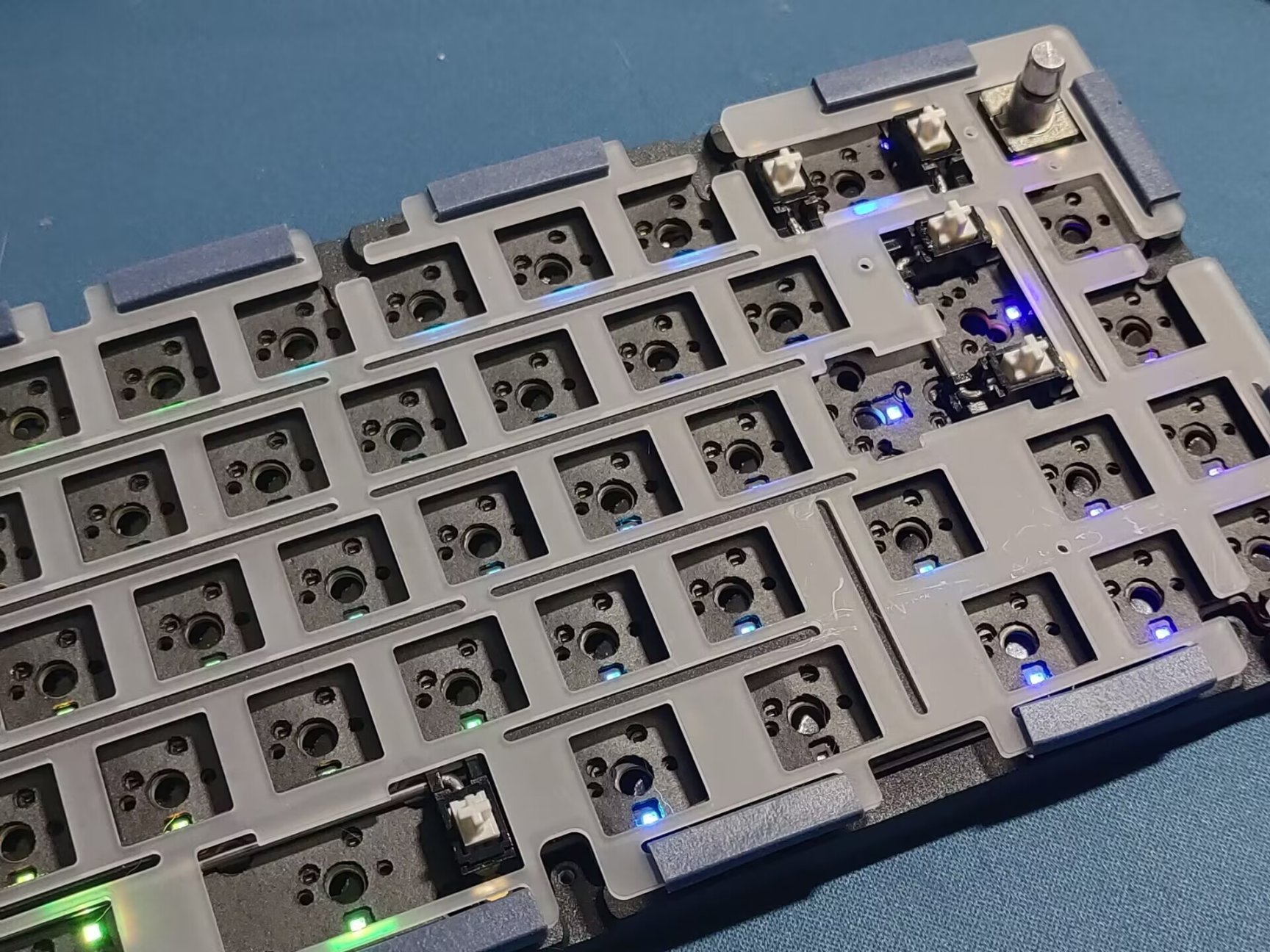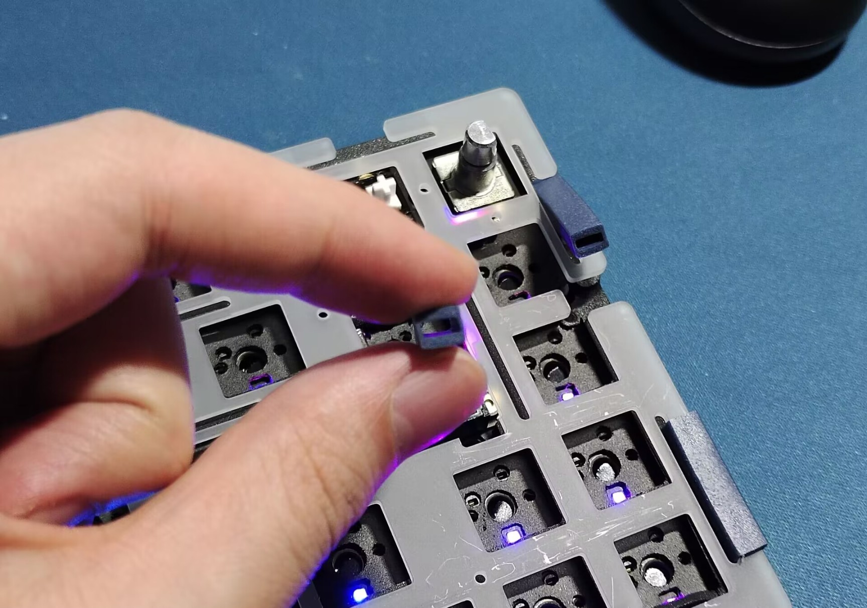 内胆组装完成之后就可以上轴了,记得装轴的时候将PCB放在稍软的材质上。我一般是放在鼠标垫上组装,这样可以保护轴座,不会让轴座被怼掉。这次的PCB是下灯位结构,因此轴脚朝上。选购键盘的时候,注意键盘为下灯位时,轴体不要购买有过高的聚光镜的轴体,否则有可能会卡原厂等较矮高度的键帽。