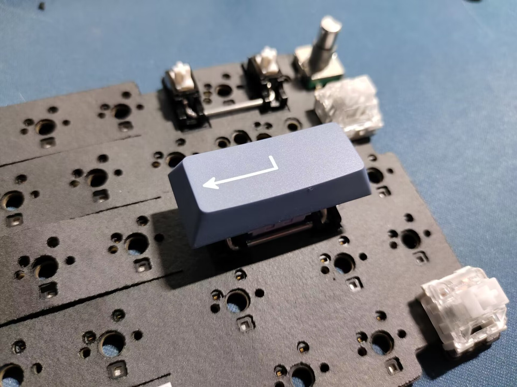 一定要记得在轴下垫上裁剪出空隙,否则触底手感真的肉到你不敢相信。这里裁剪出是为了常规的一字回车,如果想组7字回车记得裁剪出横向两排垫片的轴下垫。