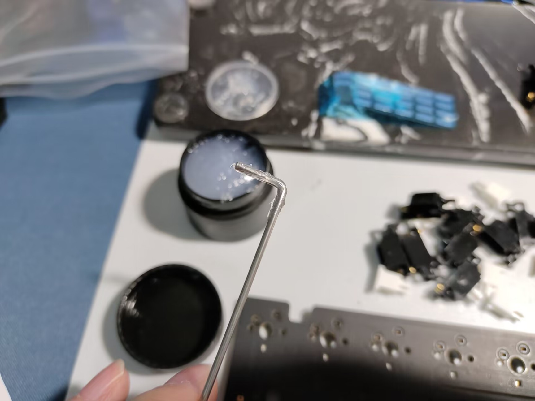 钢丝调完之后,将钢丝两端头部均匀的涂上润滑脂。润滑脂一般采用的是流动性较差,以减少假轴空隙为主的阻尼油。我这里采用的是泰阳22058,涂抹的时候记得把拐弯处也涂抹到,可以减少大键的杂音。