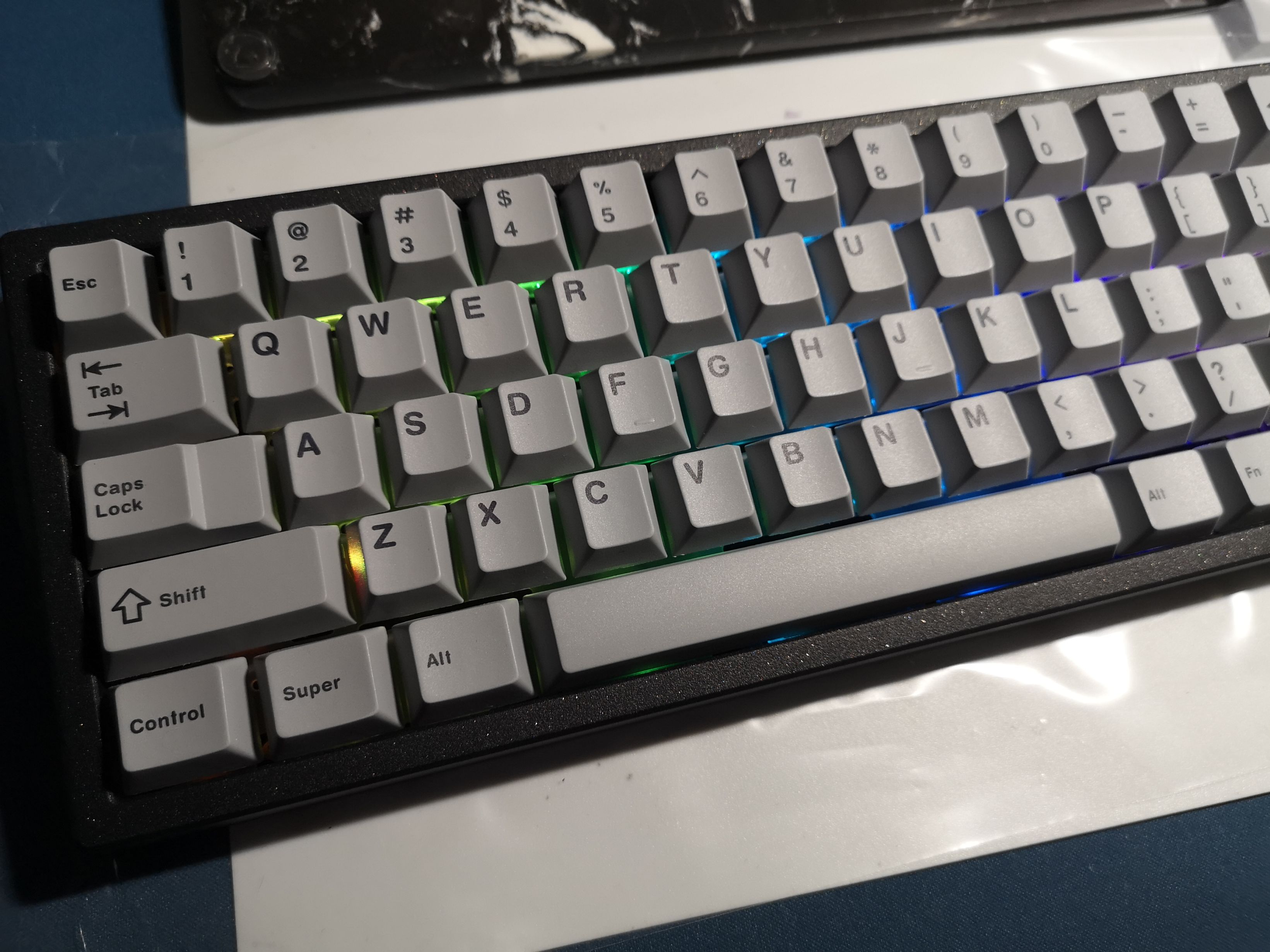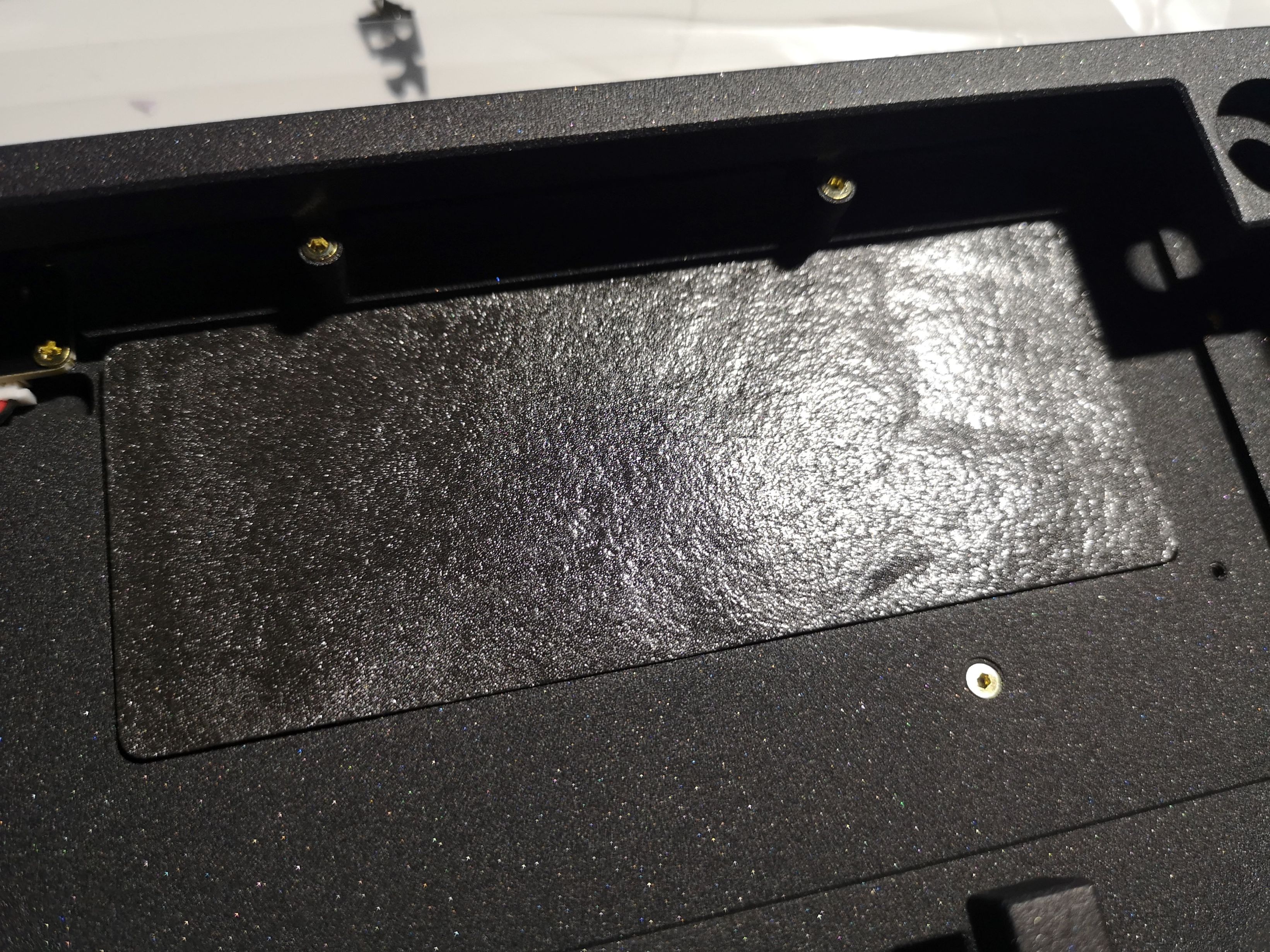 拿出键盘外壳,可以明显的感觉到这次喷涂的手感比之前的v1细腻不少,但是因为喷涂工艺,表面的触感还是比较粗糙,上手的感觉有点像摸河边最不容易被冲刷到的卵石。