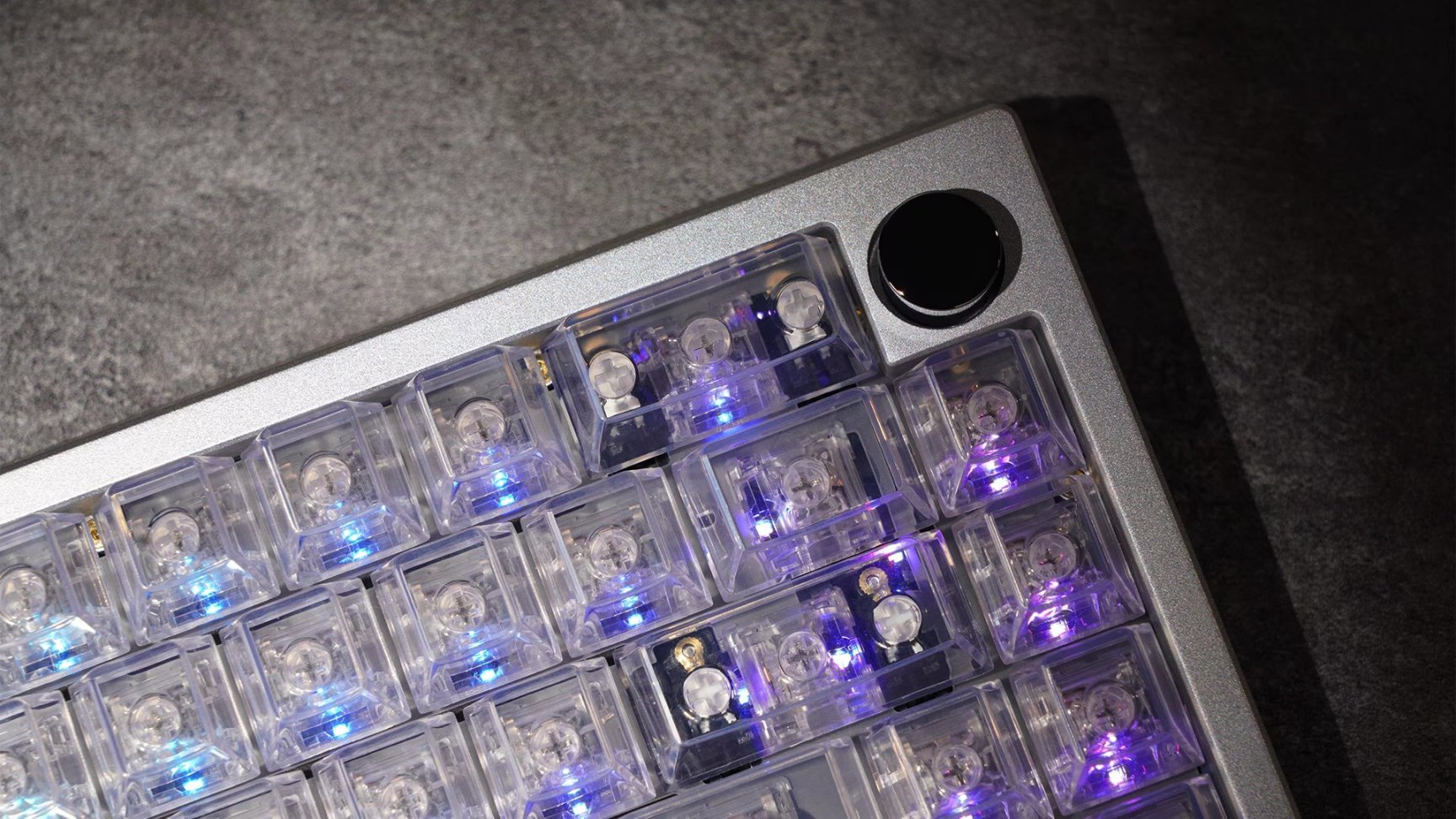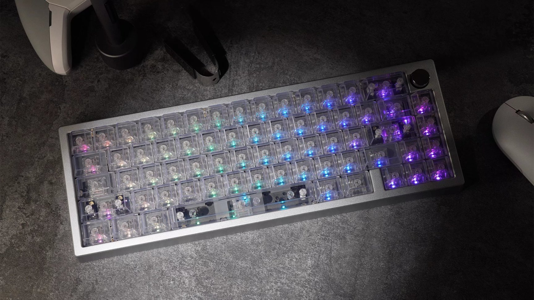 zoom65V2无缺工作室设计的一款双模,开槽pcb,rgb,蓝牙,旋钮,可变配列,玻璃饰板\不锈钢配重的铝坨坨客制化套件。对,是铝坨坨,市面上少有的rgb开槽蓝牙的铝坨坨。在过去v1阶段就有着很高的销量,v2更新了模具让键盘从上下盖变为了天包地结构,pcb从二层变成了四层为了同时兼顾rgb和pcb开槽,并且底部设计更为出彩,变为了了玻璃和不锈钢相结合的底面设计,甚至gasket结构也从垫片换为了更特殊的硅胶套,更给这把键盘带来了新意。