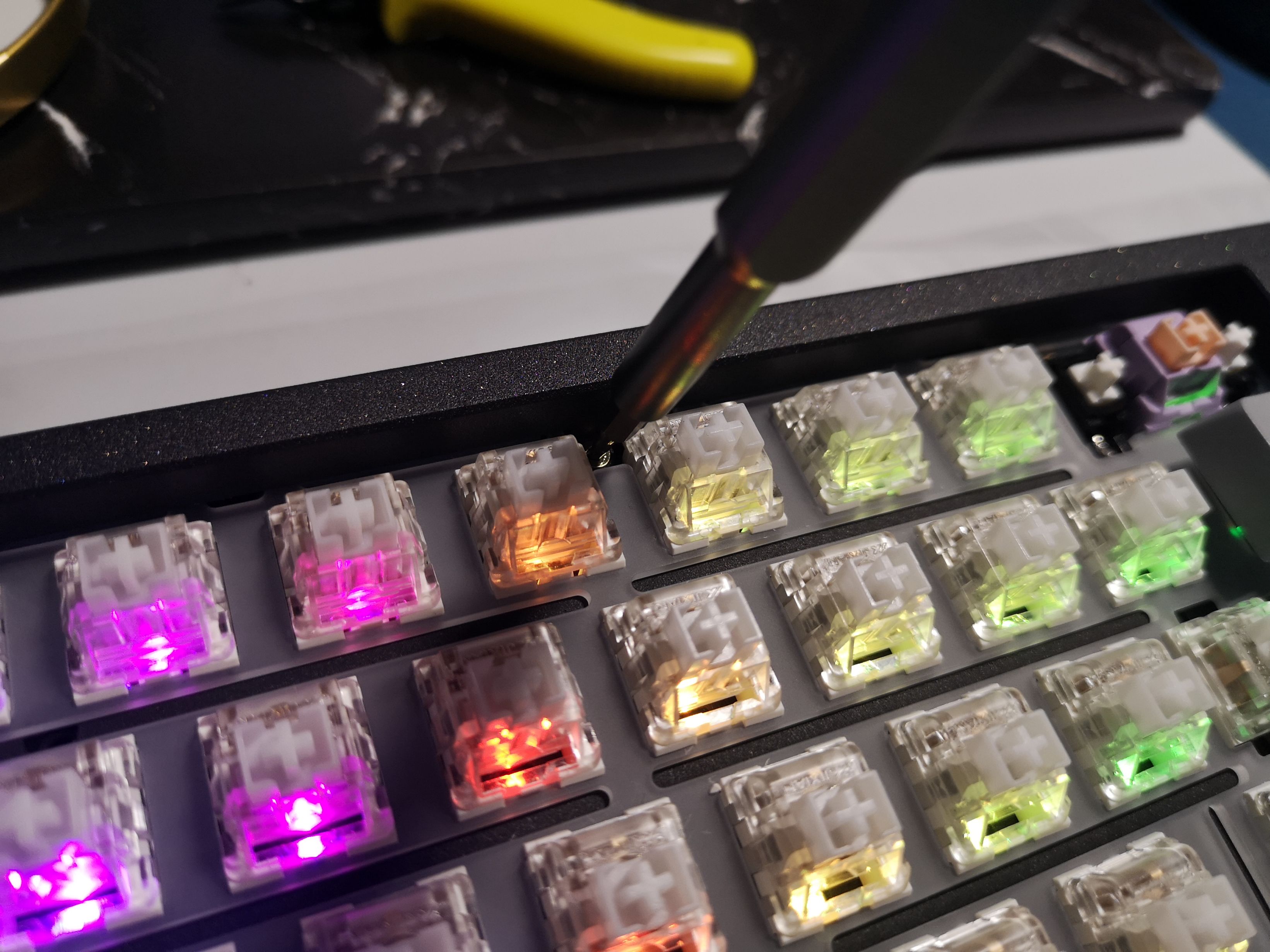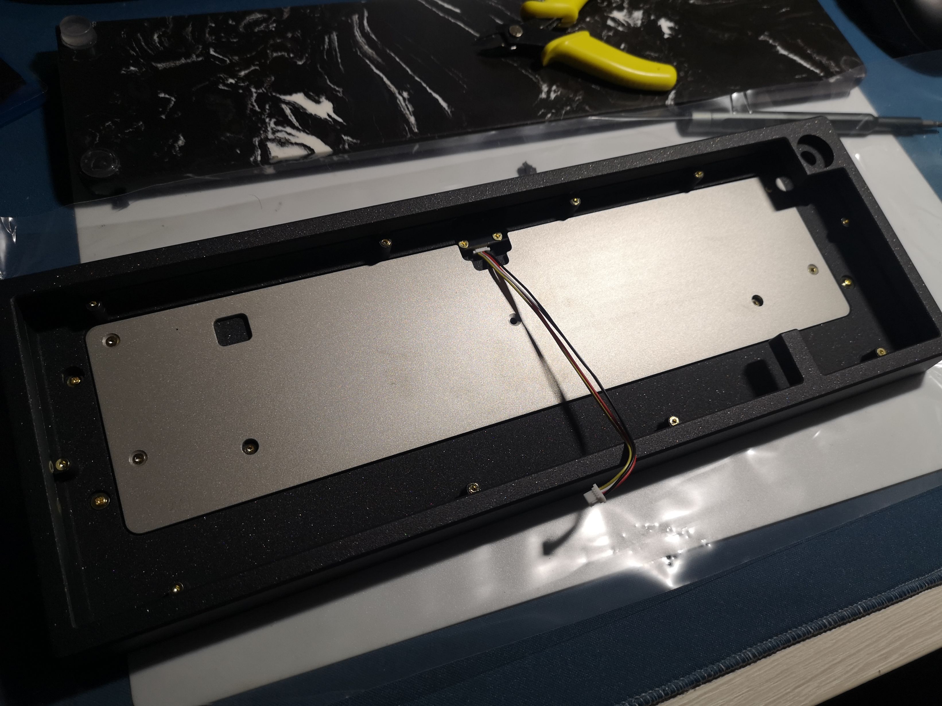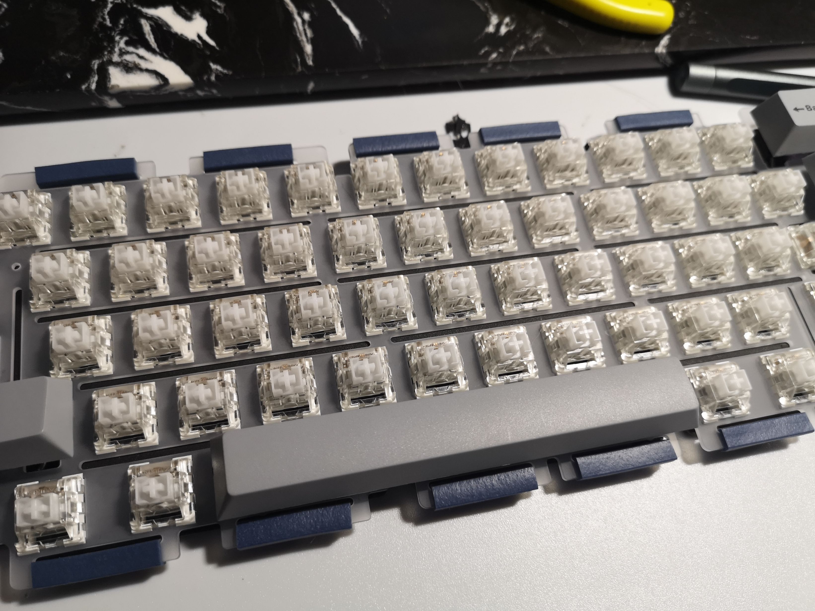 首先拿到一个客制化套件,第一件事就是组装键盘内胆,这一项一般会在键盘外壳组装之前进行,而组装内胆的第一点就是大键调教。