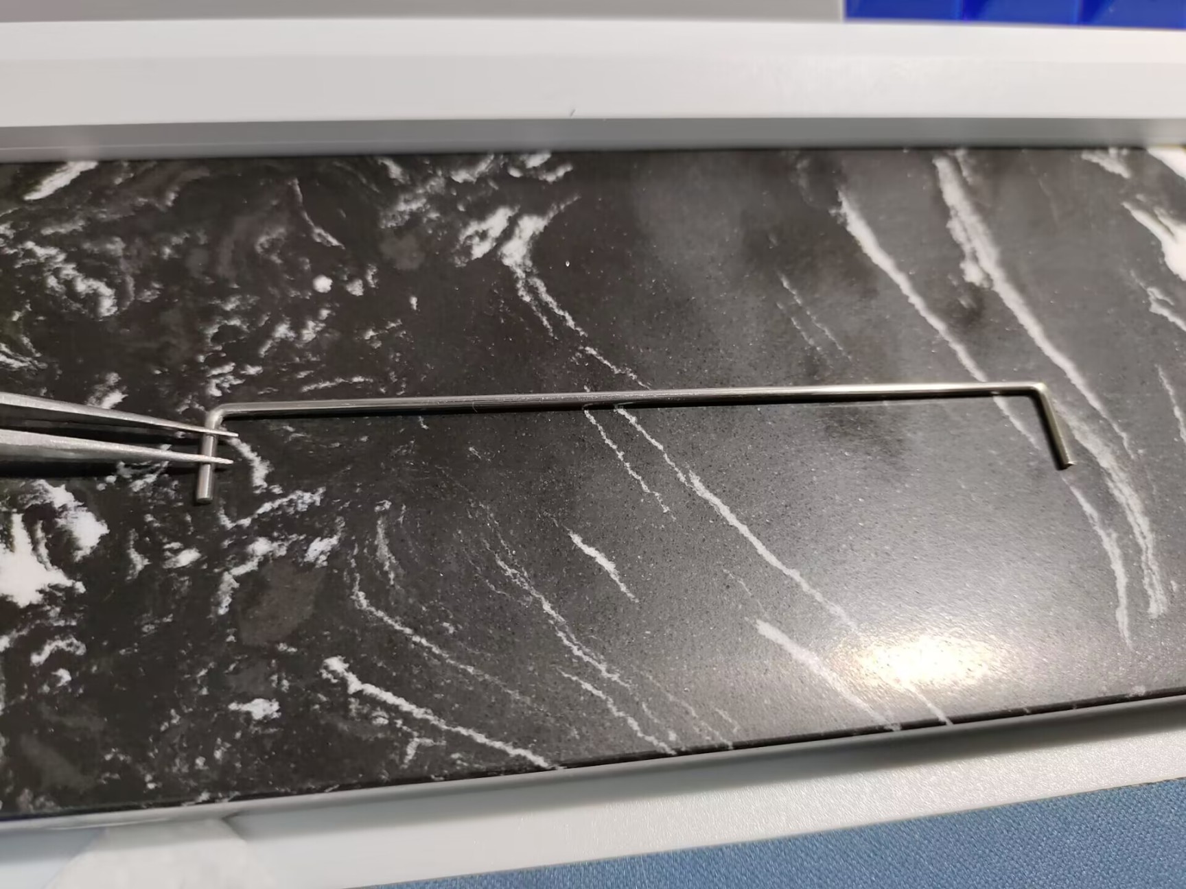 卫星轴第一步是调平钢丝,将钢丝放在一水平面,然后使用镊子轻点两头。
