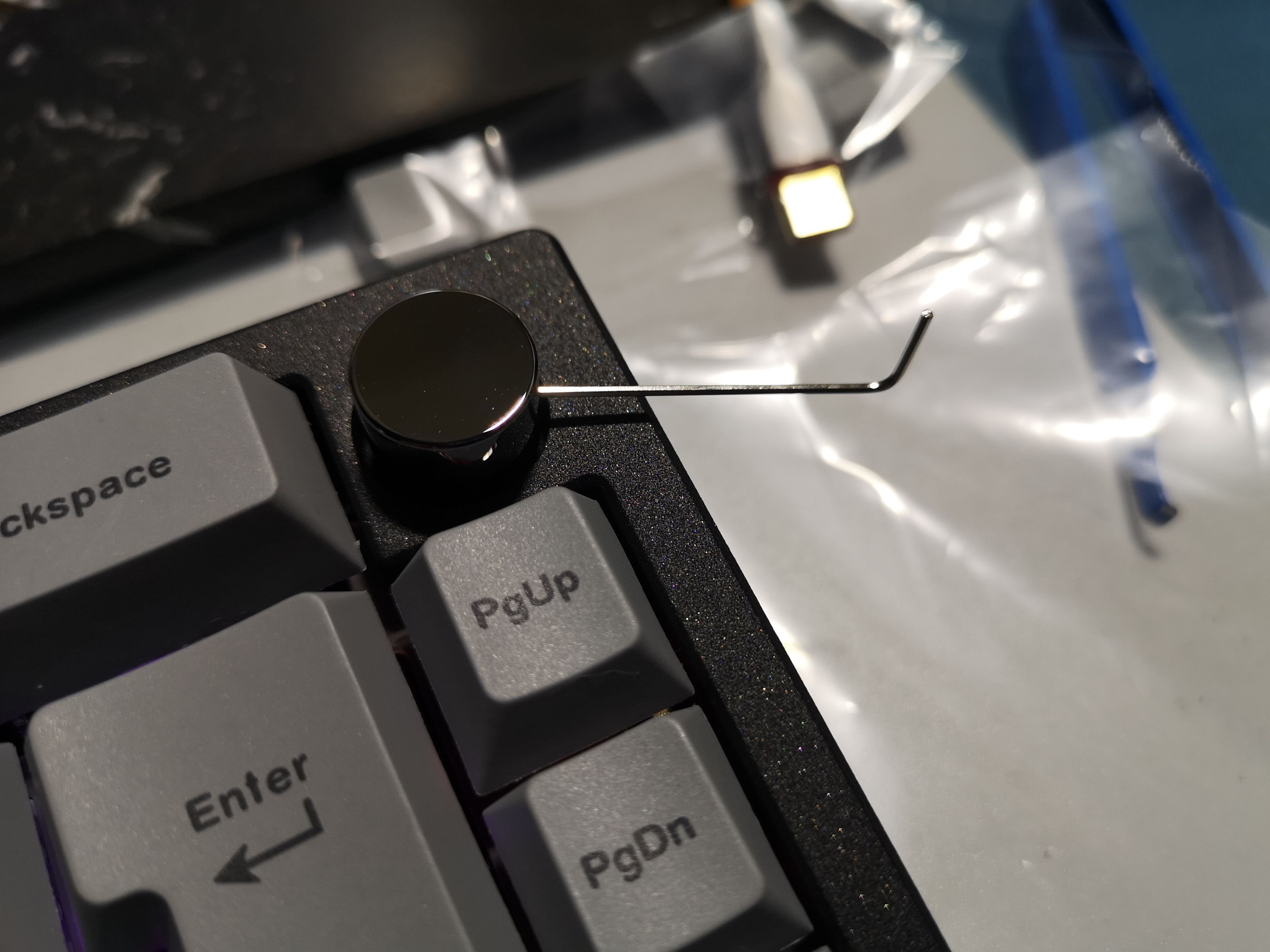 将旋钮插上键盘编码器,旋钮是D字口的,D口对准编码器缺口即可插上。微微提起旋钮,使用工具包中的小六角扳手插入旋钮螺丝口拧紧即可。