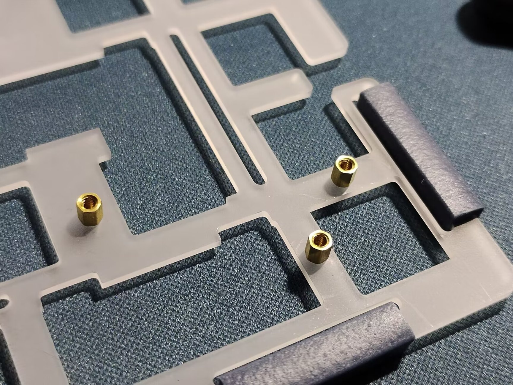 这时候将定位板上装gaket套管。ZOOM65V2采用gasket套管的结构的垫片设计,垫片既可以作为gasket结构内胆和上下盖的软连接,让键盘声音更纯粹,留有形变空间从而带来软弹手感,又可以起到限位作用。