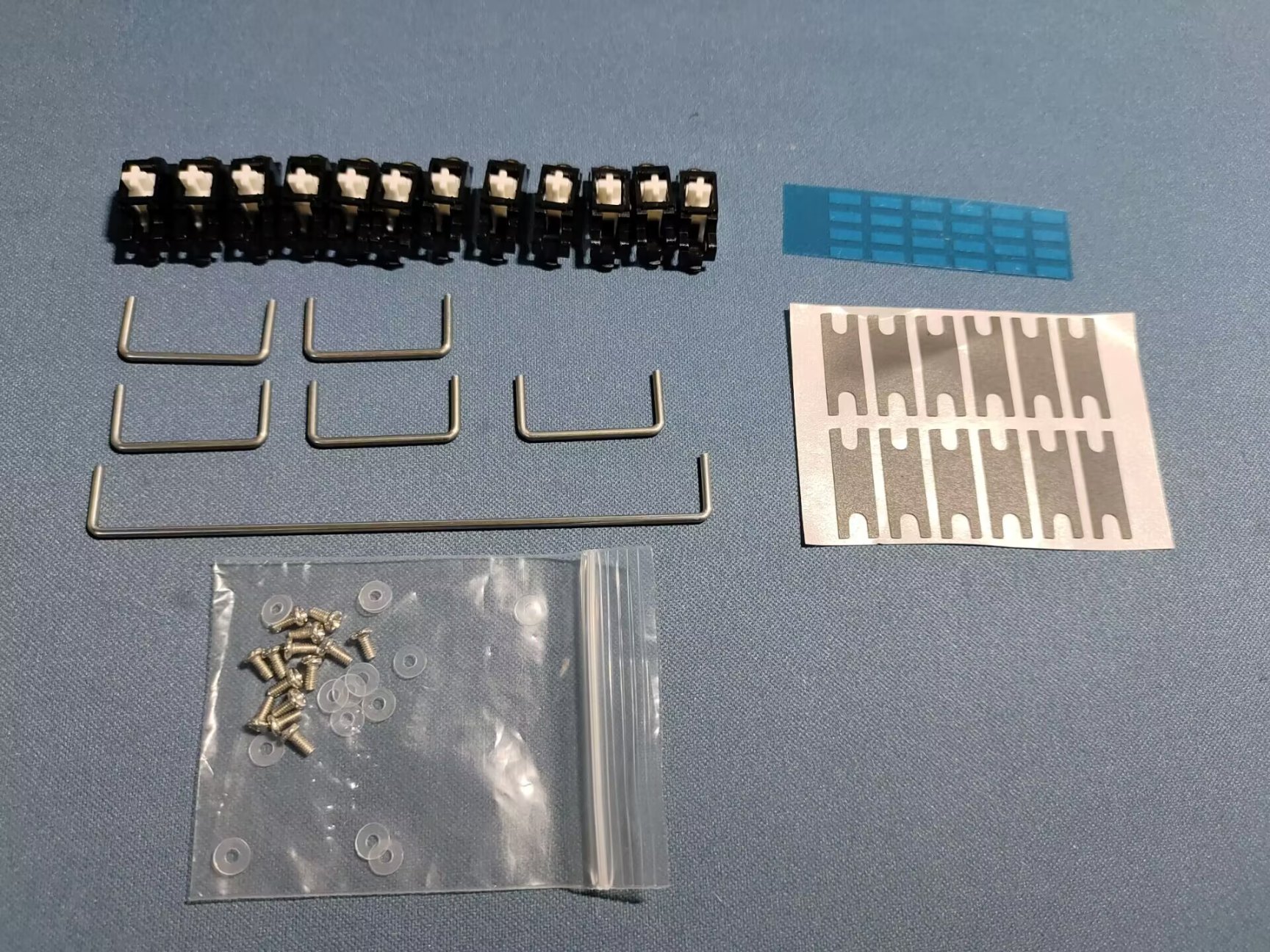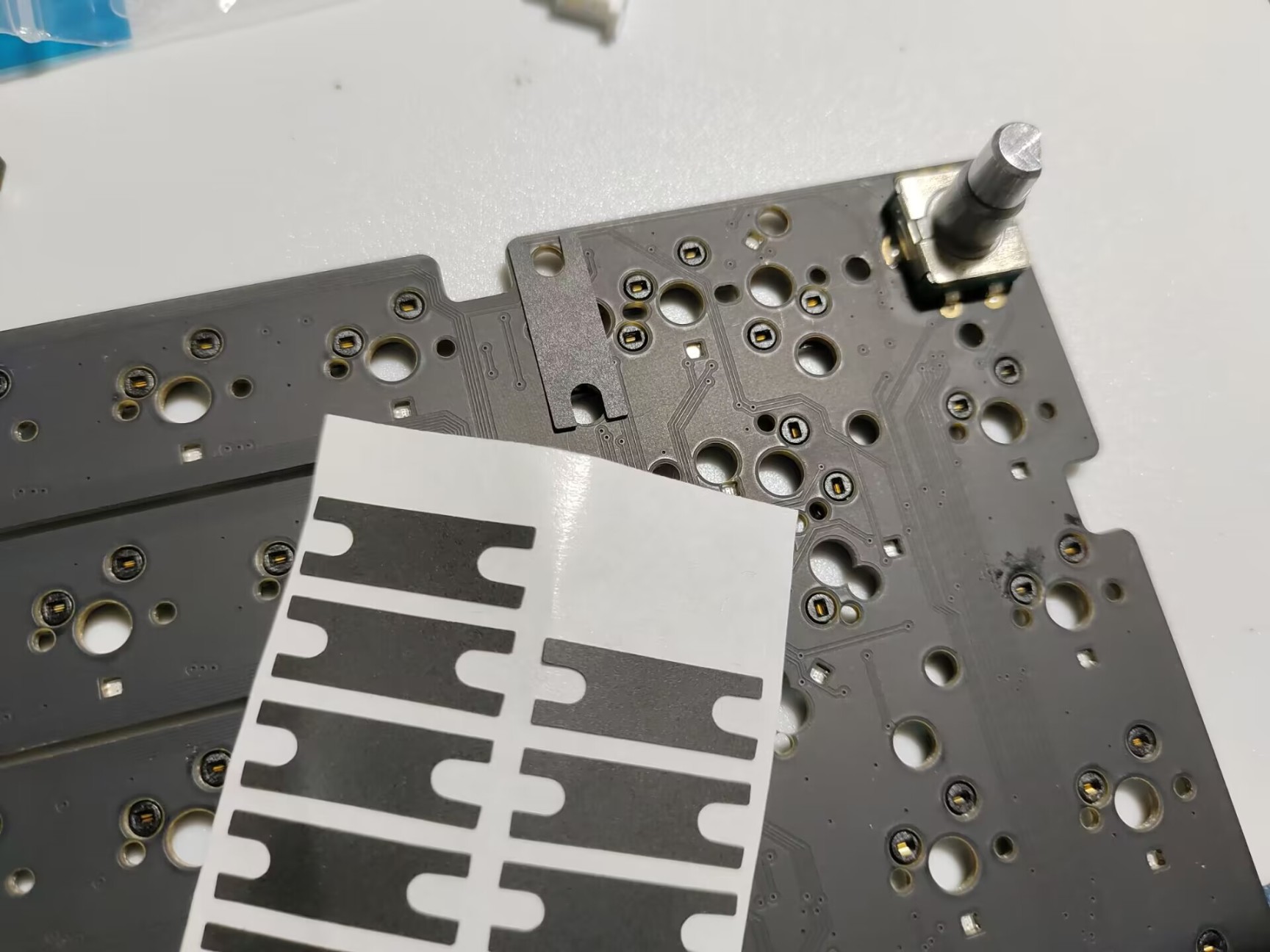 调教好的卫星轴放在一边,这时候将赠送的卫星轴垫片贴在PCB上。贴的时候一定要确定好自己使用的配列,根据自己的配列来粘贴相应数量的垫片。