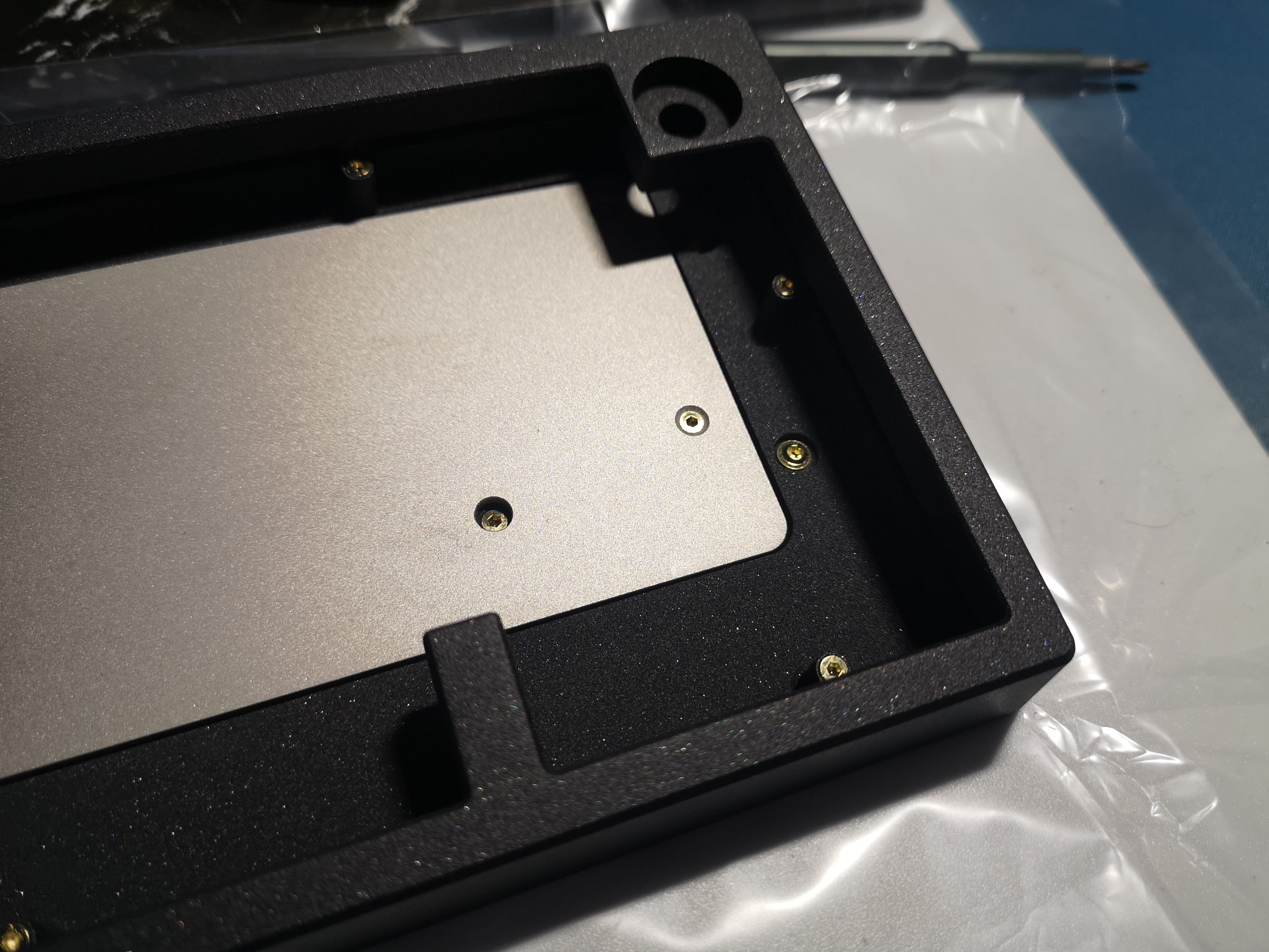PCB放好之后就可以盖上上盖,将螺丝拧紧即可,但是不建议使劲柠的特别紧,如果多次拧螺丝有可能会导致键盘滑丝。