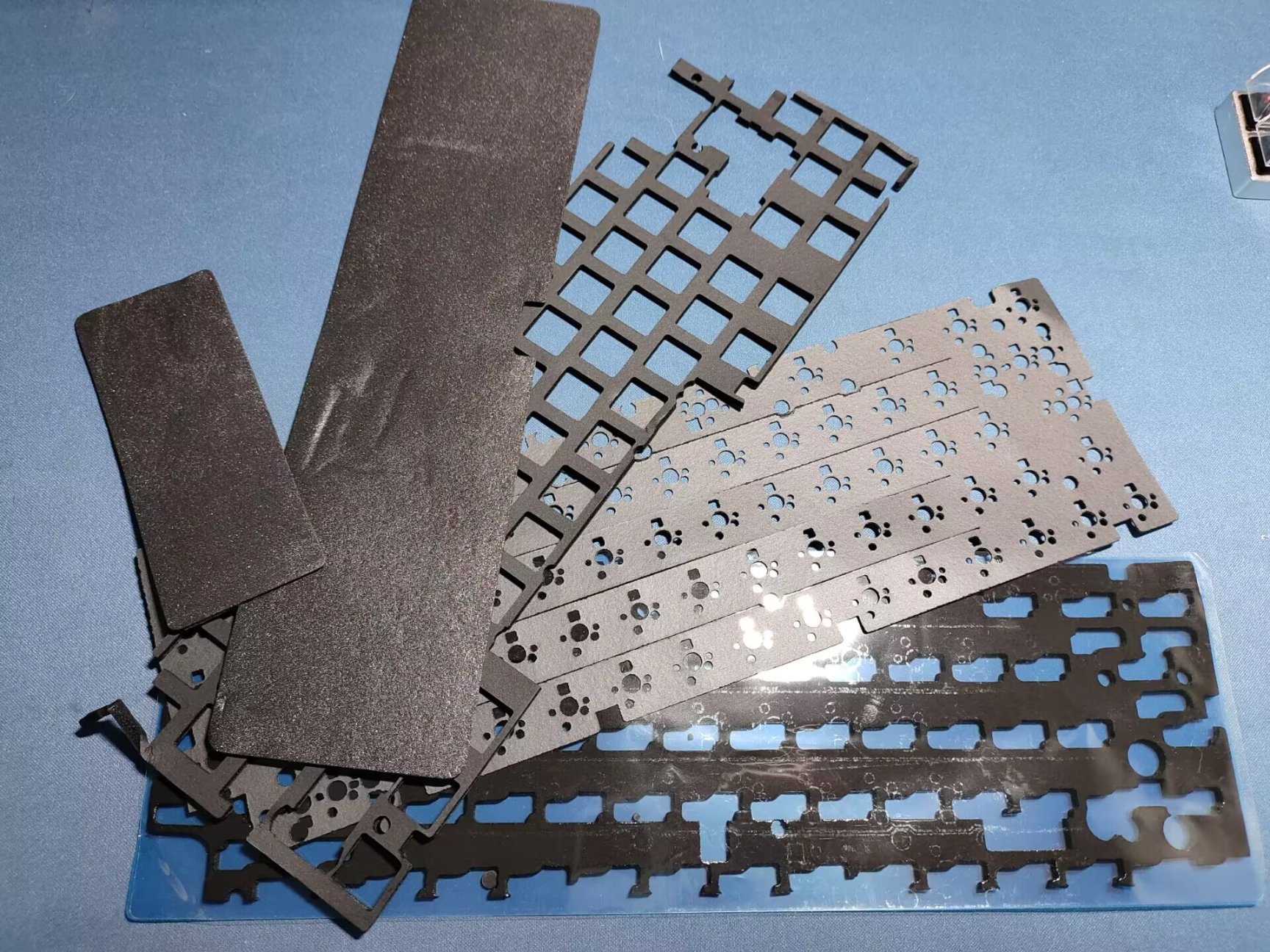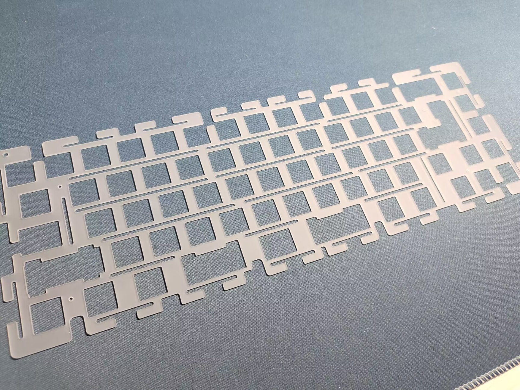 开槽pcb后便是开槽定位板,两者相互作用下给键盘来带了相对软弹的手感。当然软弹并不是轻轻一按就有的致命软弹,而更多是快速按压轴体触底后不会产生夸张的共振,不会有难受的震手感。