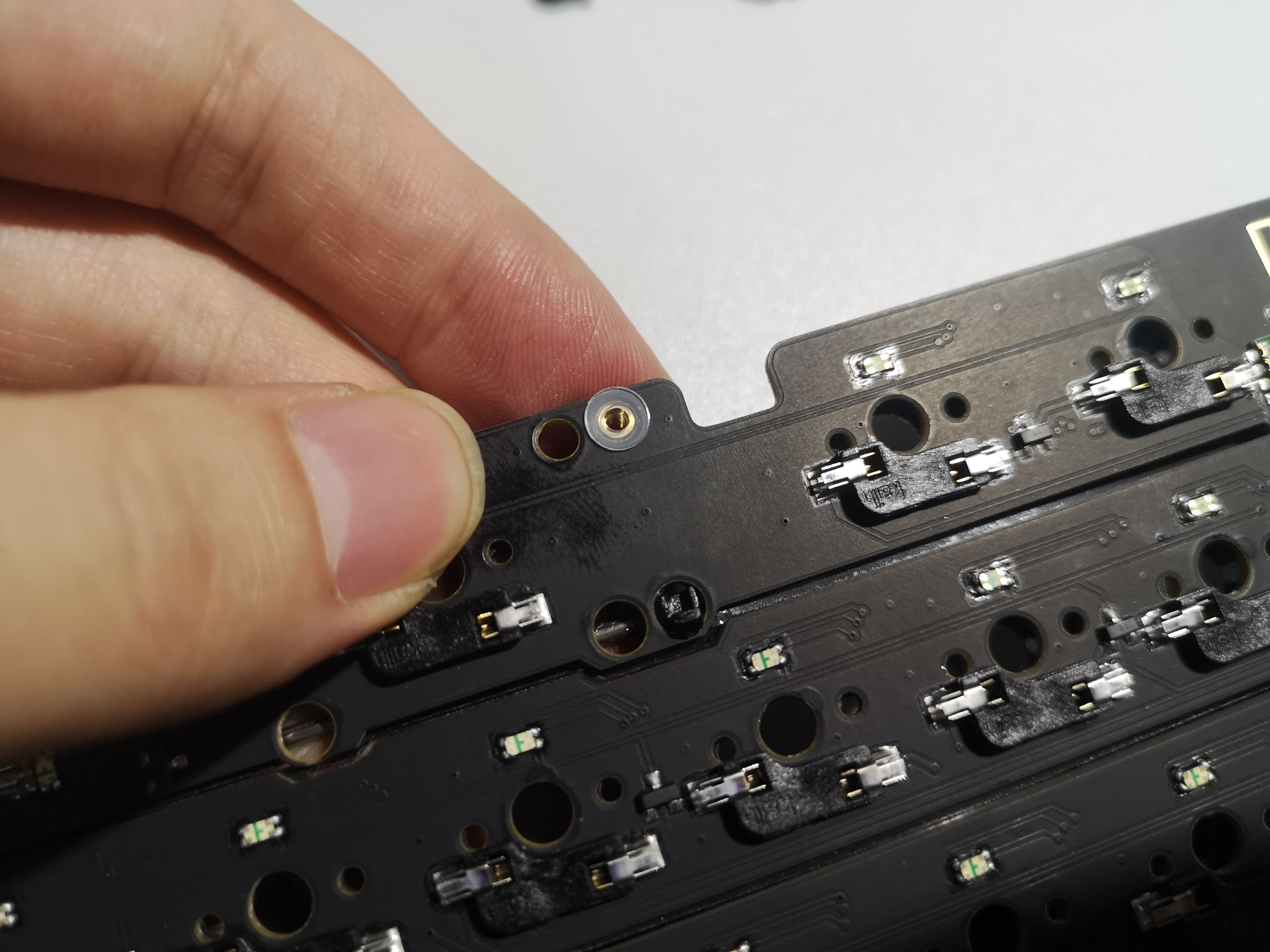 这时细心的朋友发现,键盘还赠送了几个小限位铜柱,可以连接pcb和定位板。虽然铜柱正常情况下没什么用,然而在换轴时可以明显的起到固定作用,拆掉轴体时,键盘内胆不会从定位板上脱落位移。