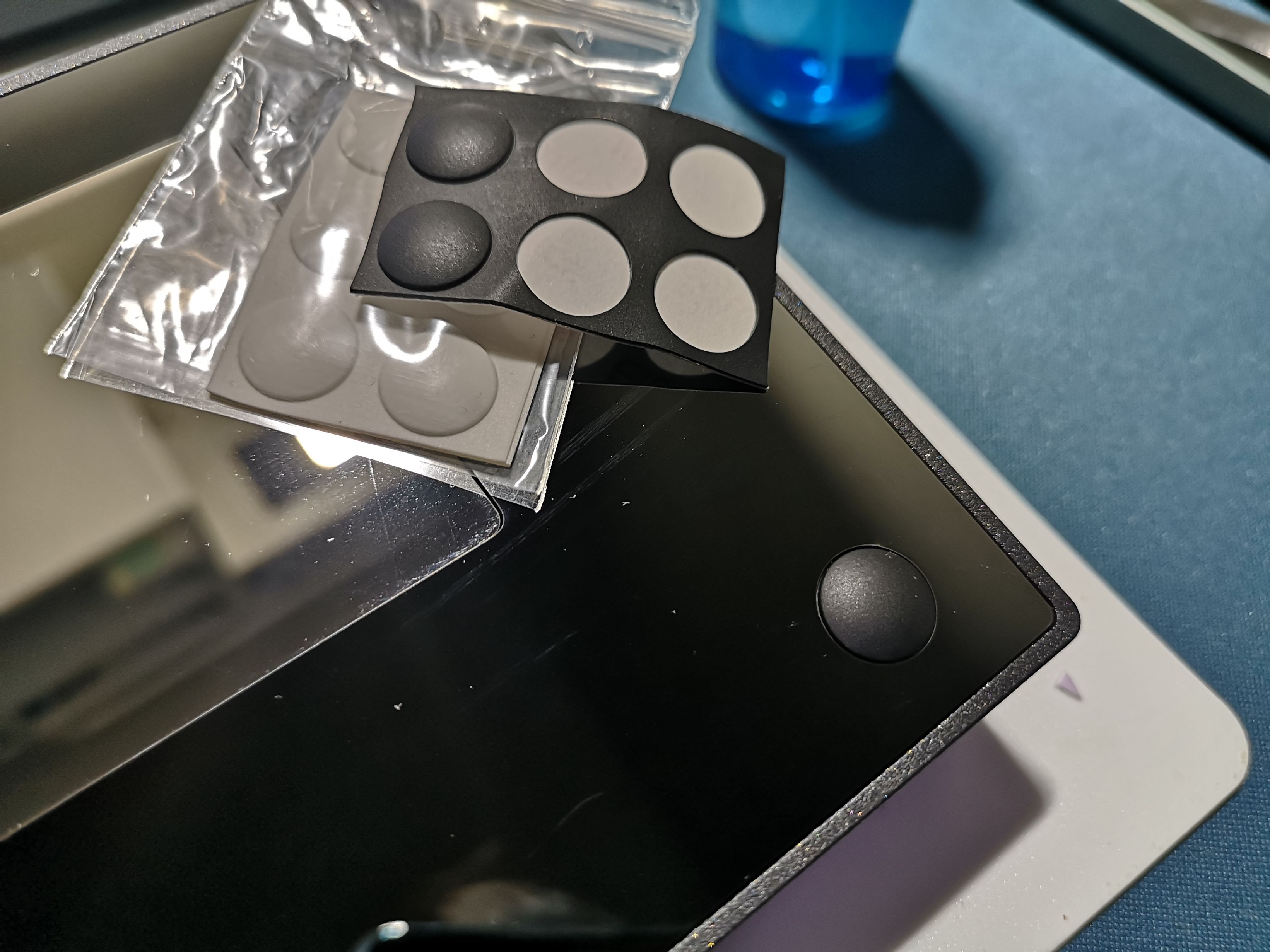 最后记得将键盘翻至背面,给键盘背部贴上脚贴。出厂赠送了黑白两种颜色的脚贴,按照喜欢的颜色贴上即可。