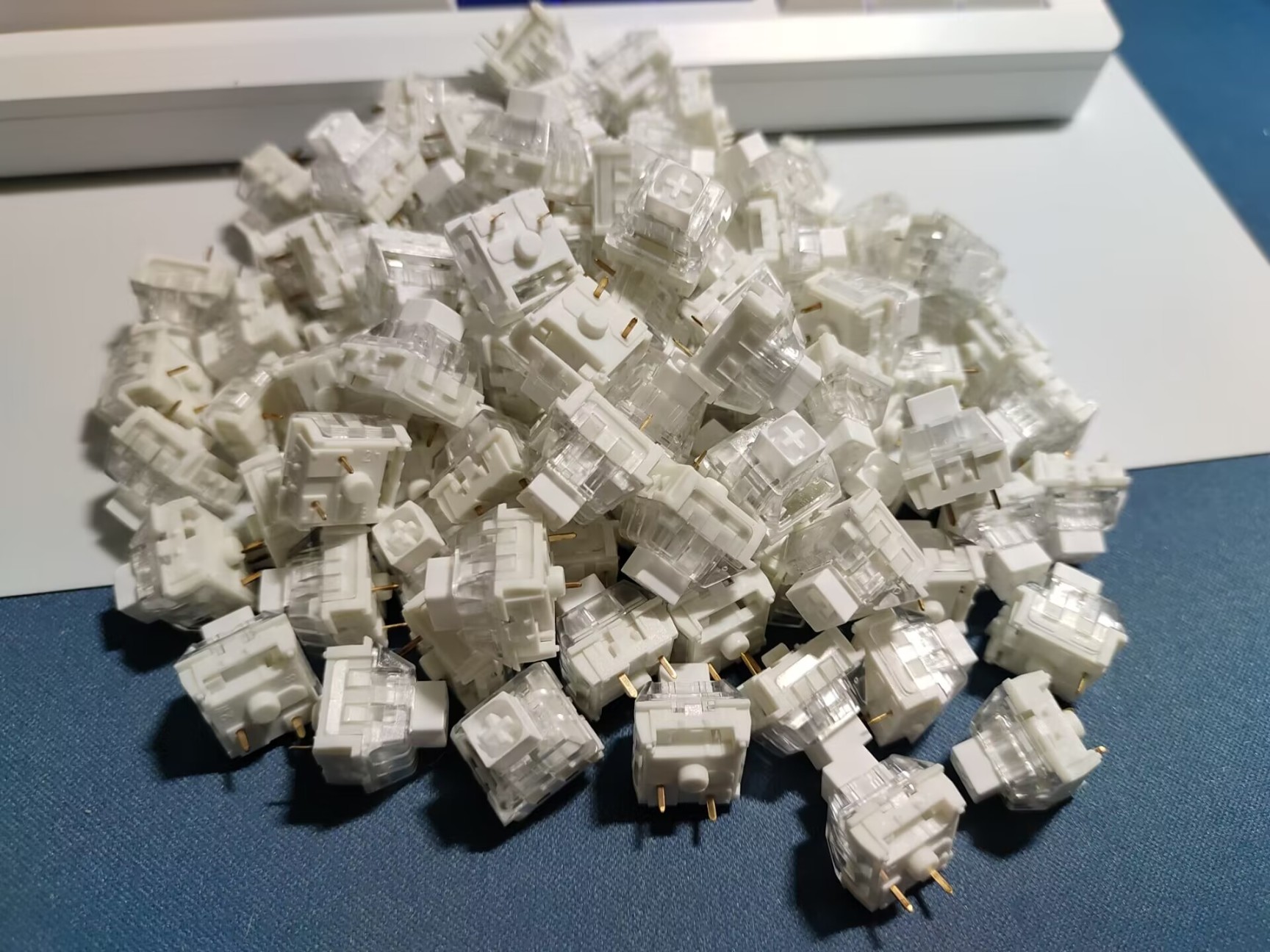 我这次最初开始我使用的轴体是集贤白轴(又叫鸡掰轴)。在提前触底类银轴这个类别里,其压力和手感都是非常好的一款。轴体的压力是45g的常规压力,并且使用二段的加长弹簧,轴心精细稳定,手感跟手有力,售价却仅为1块3毛一颗。按照其官方说明在到手时需要按压50下左右,将内部的润滑脂才会完全盘开,手感则会有进一步的提升。