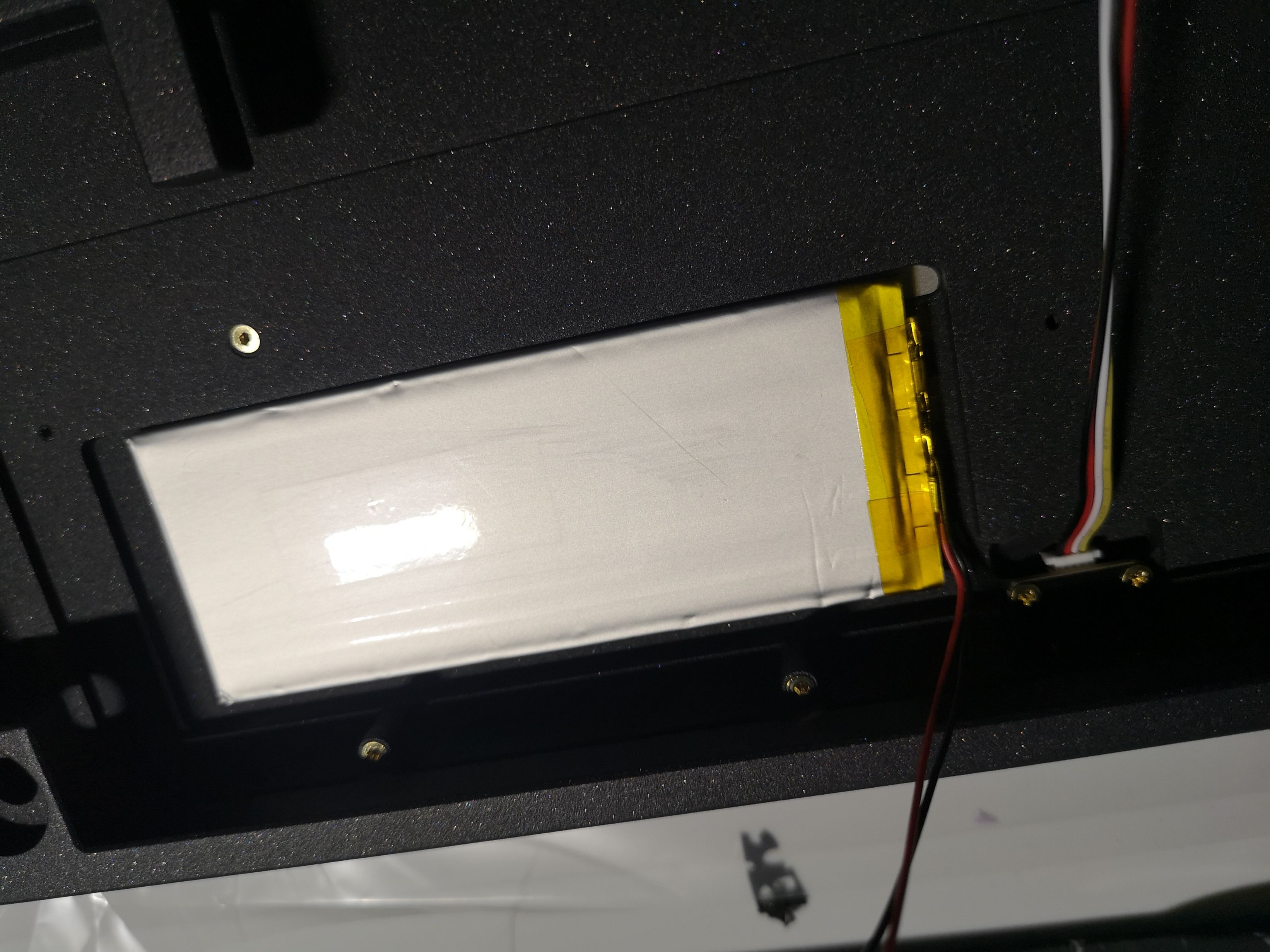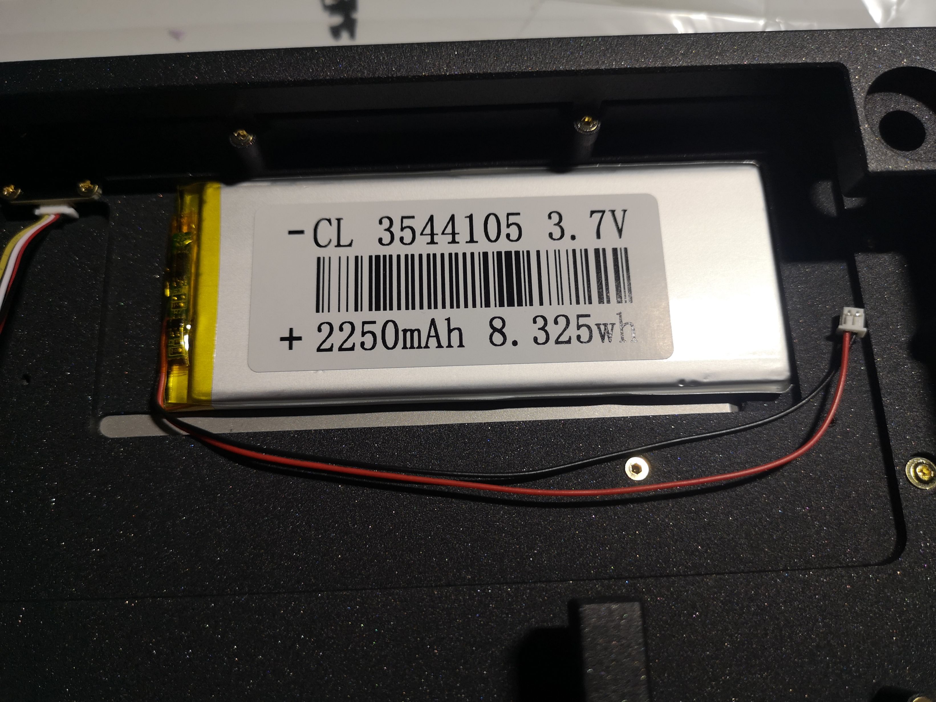 接下来安装电池。将内部配重拆卸下,电池走线部分靠近小板、字符朝下塞入其中。因为电池的走线在PCB左侧,走线较长,因此要格外注意电池走线。