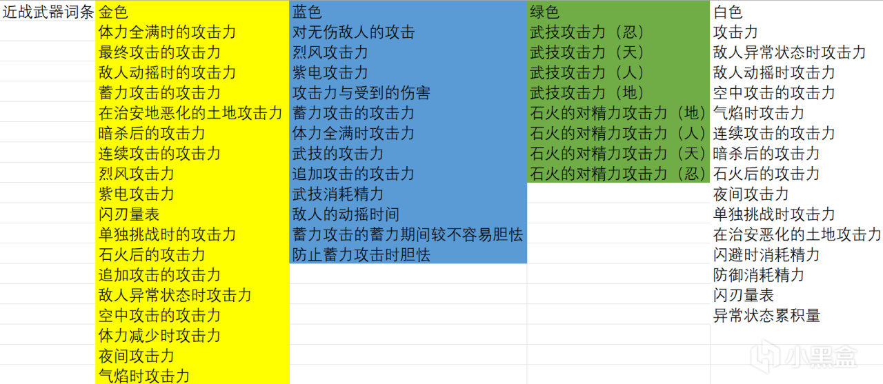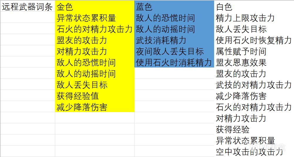 短槍的攻擊力,副武器的攻擊力,弓/火槍的攻擊力,閃刃後精力恢復,體術的攻擊力