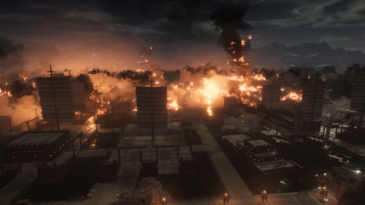 在动作系统之外,庄知彦精准地把握住了《无双》系列的另一重魅力:大战场。这一传统自古有之,主角武将在一个庞大的沙盘内四处救援,在救援的路上顺便砍瓜切菜。而《起源》则是将此前百人规模的布景直接进化到千人甚至万人——最关键的是优化竟然神奇地顶住了,于是玩家便能在本作中感受到有史以来最为宏大的战场塑造。