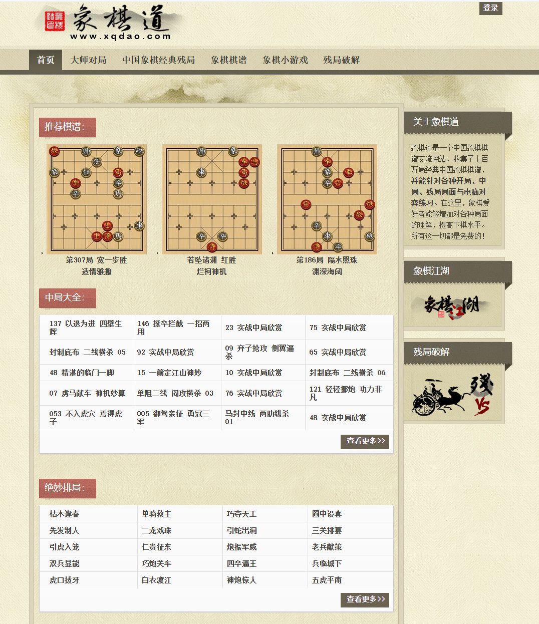 介紹:象棋道是一箇中國象棋棋譜交流網站,收集了上百萬局經典中國象棋棋譜,並能針對各種開局、中局、殘局局面與電腦對弈練習。是一個免費在線象棋殘局棋譜交流網站。
