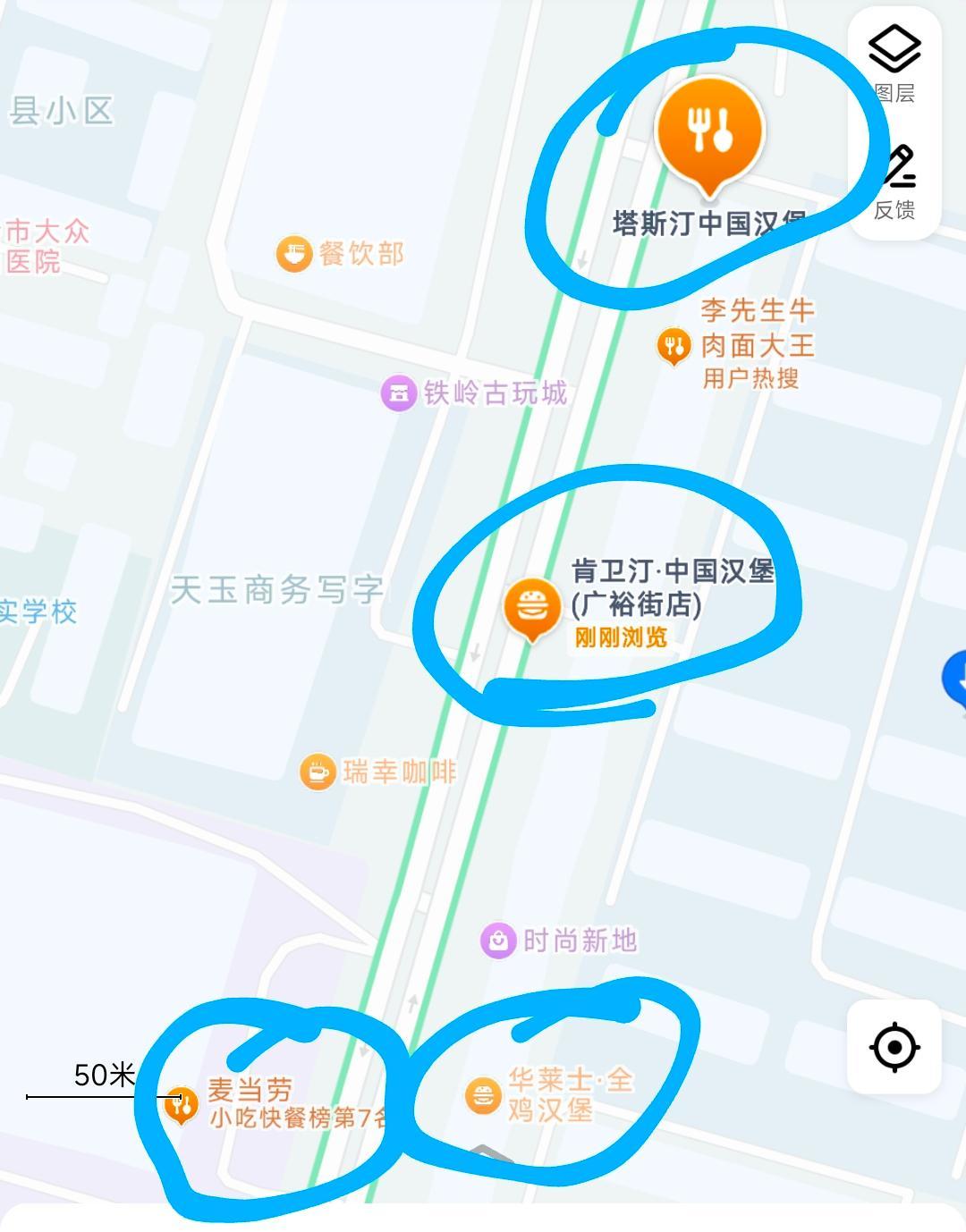 店鋪位置,這位姐的【塔德堡】開在一個園區中,結果園區門口就有一家漢堡王,園區外面還有一家華萊士和塔斯汀...
