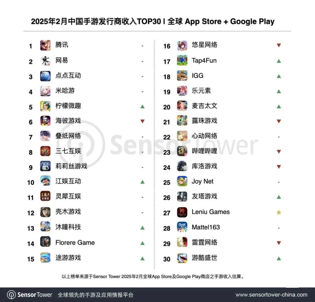 根據第三方數據網站統計,《無盡冬日》兩年來的累計收入已經超過20億美元。其背後的點點互動,也在2025年2月的中國手遊發行商收入榜單中位列第三,僅次於騰訊和網易。