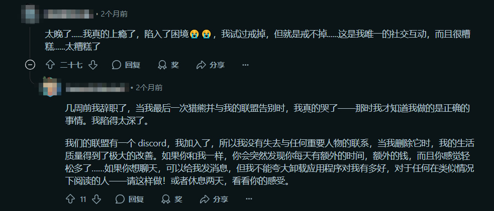 在Reddit、X等社交平臺上,從不少玩家的帖子中能看出,他們清晰地意識到了這套SLG玩法下潛藏的問題——“貨不對板”的廣告騙局、誘導消費的營銷策略、維持現有戰力排名而逐漸增加的沉沒成本等等都被不少玩家花式吐槽,但提到是否要退遊時,大多數人又表現出各種不捨之情,一方面這遊戲的確給過他們不少樂趣,而更難以割捨的,則是由同盟構築的社交連結。