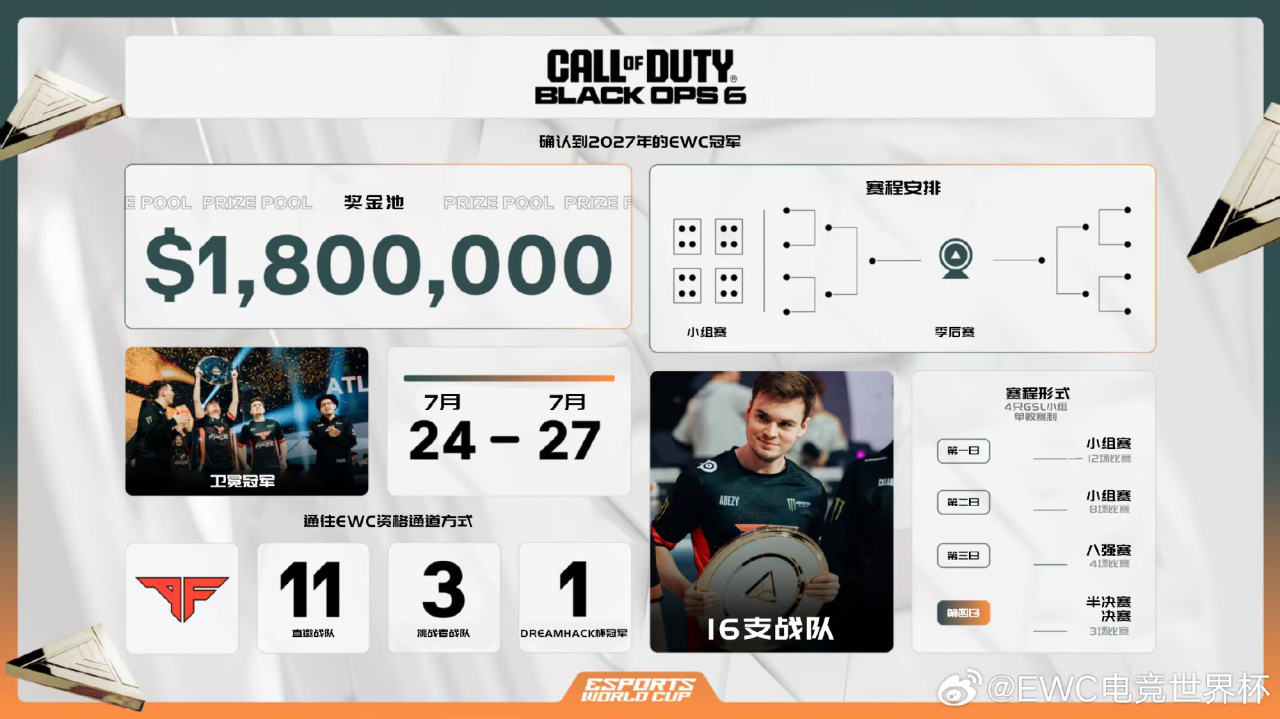 第二屆電競世界盃官宣《黑色行動6》項目將於7月24~27日進行,獎金池共180萬美元(約合人民幣1302萬),16支隊伍參加,包括上屆冠軍FAZE直邀和其餘15支。
