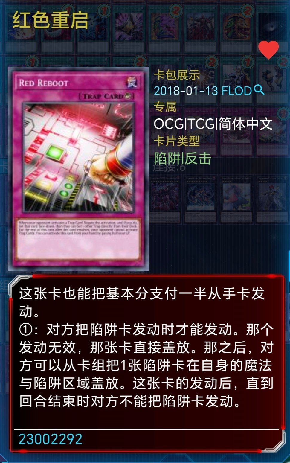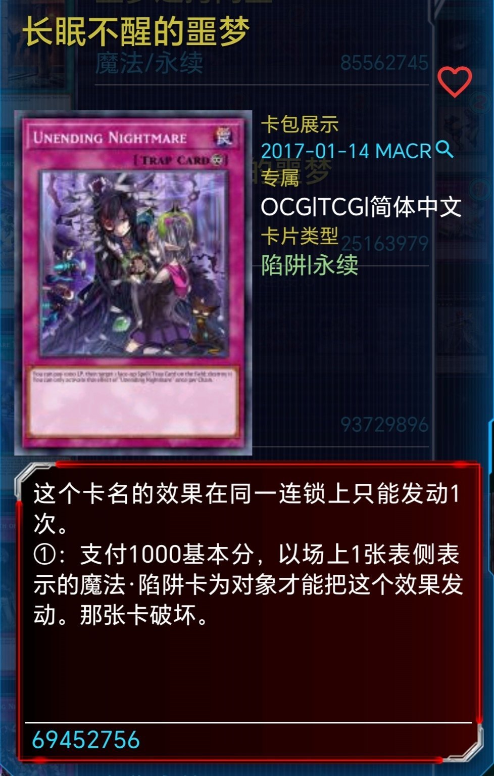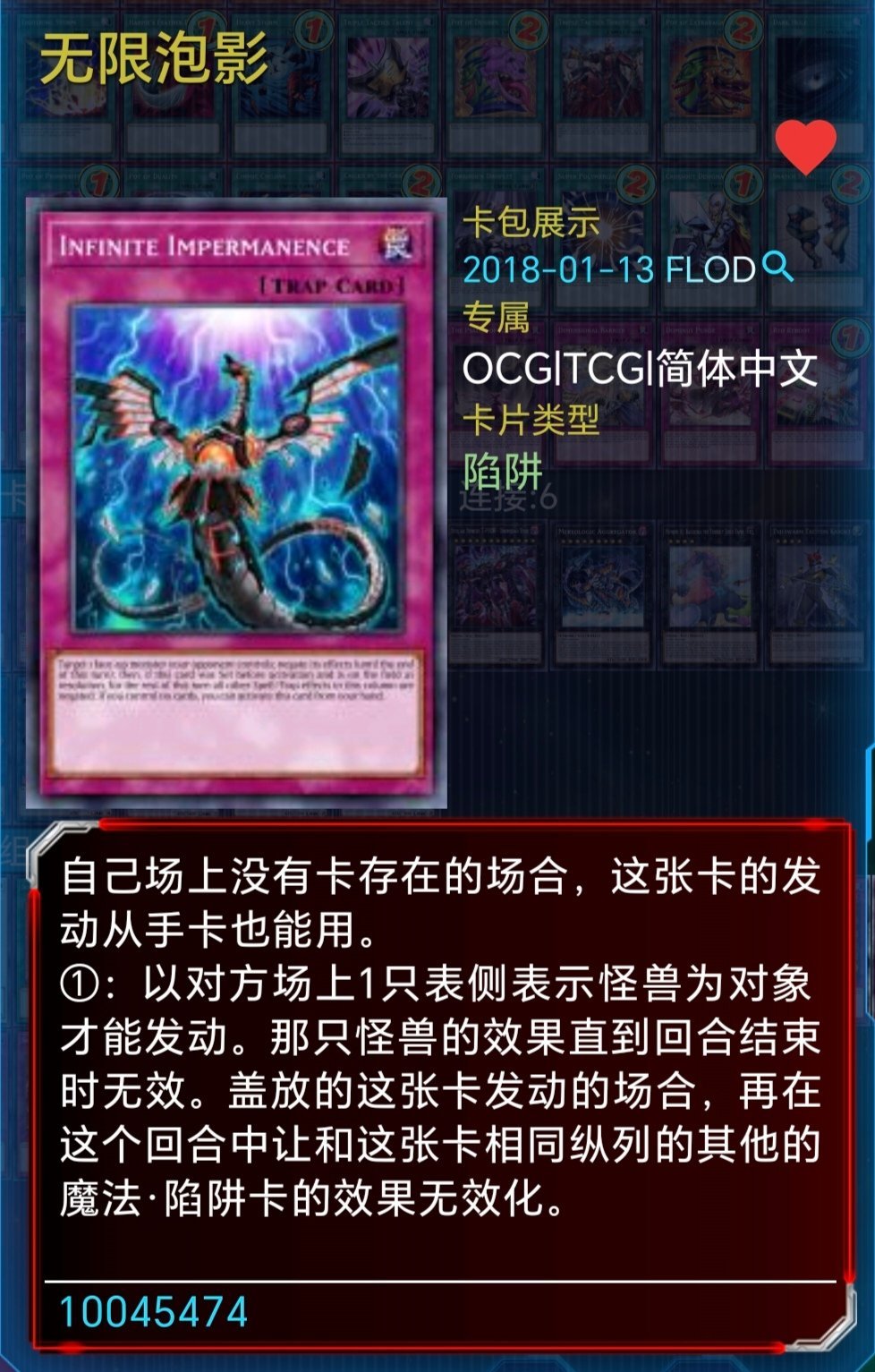 不錯的手發陷阱,效果與泡影似而不同,雖然沒有本家字段,但是目前本家唯一具有檢索能力的卡片,需要注意很強的自肅,一般beat向的卡組纔會選擇使用。