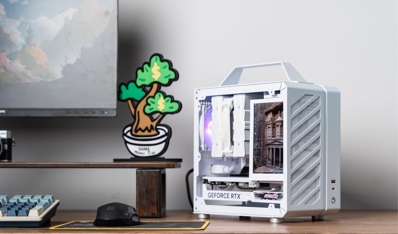 本套除了在整体搭配上都是选择了白色的硬件之外,为了发挥副屏真正的便携性,选用的则是9.9L的C24机箱,机箱的高度也就是仅有一般的矿泉水高度,算是一款体积非常小巧的ITX主机