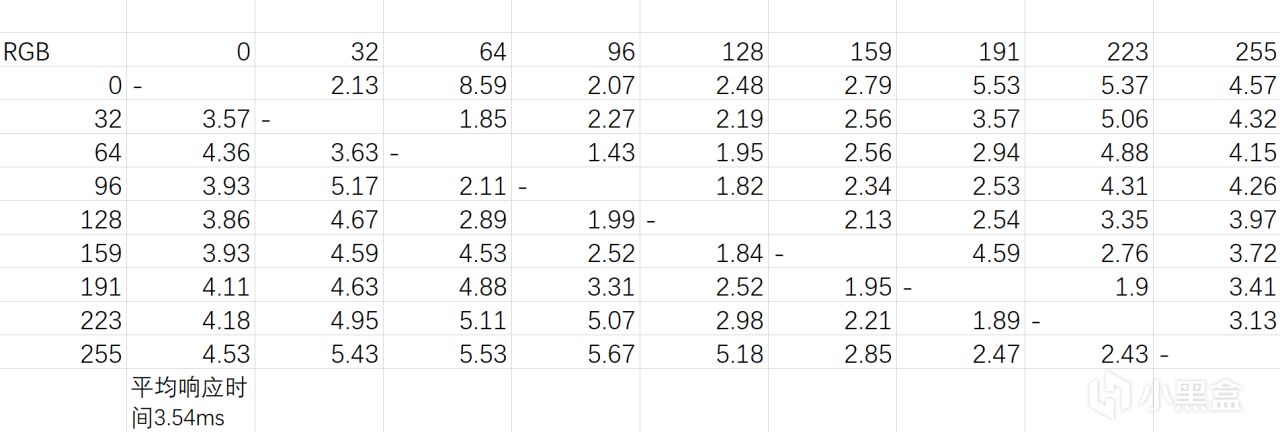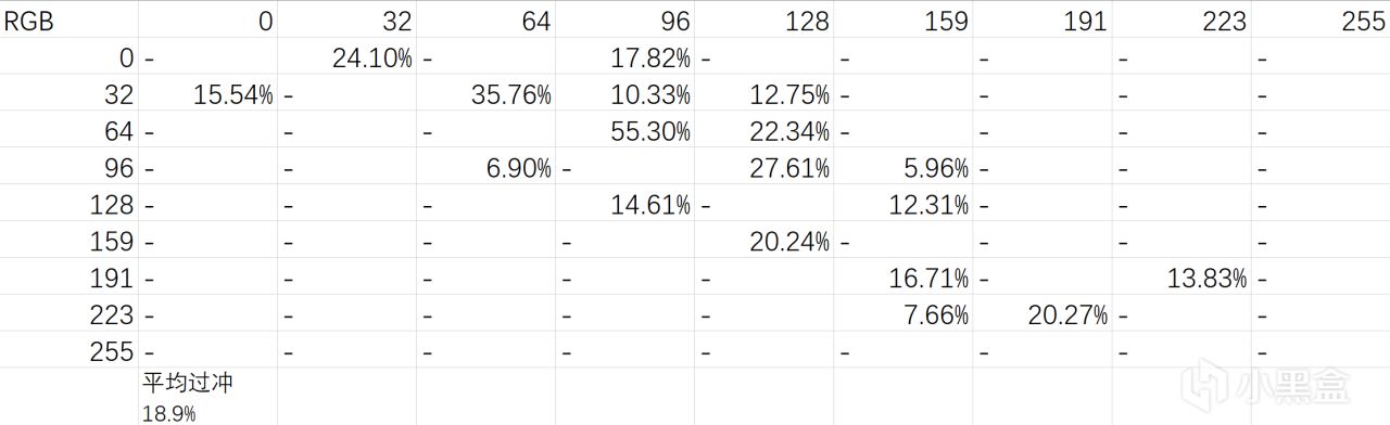 此時顯示器的GTG響應時間達到3.54ms,平均過沖達到18.9%。性能表現是可以的,對於動態視力極其牛逼的靚仔來說,可能會收到過沖干擾。